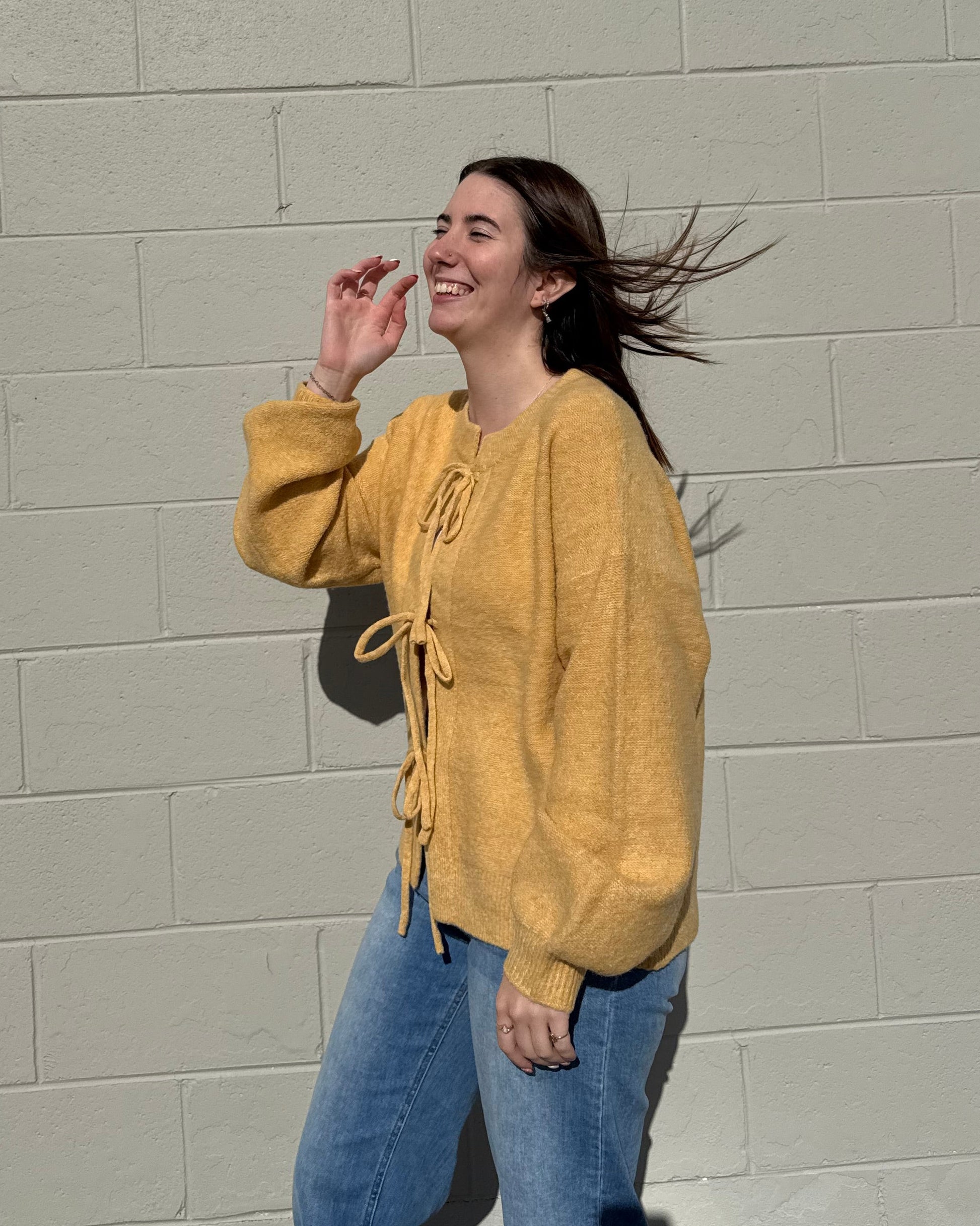 The Addyson Top is a charming light yellow cardigan that brings effortless elegance to your everyday wardrobe. Crafted from soft, cozy fabric, this versatile layer features three delicate ties running down the center, adding a refined touch of detail. Perfect for layering over dresses, tees, or tanks, it provides gentle warmth without bulk. Whether you're dressing up a casual look or adding polish to your ensemble, this sweater cardigan is the sophisticated extra layer you've been searching for.