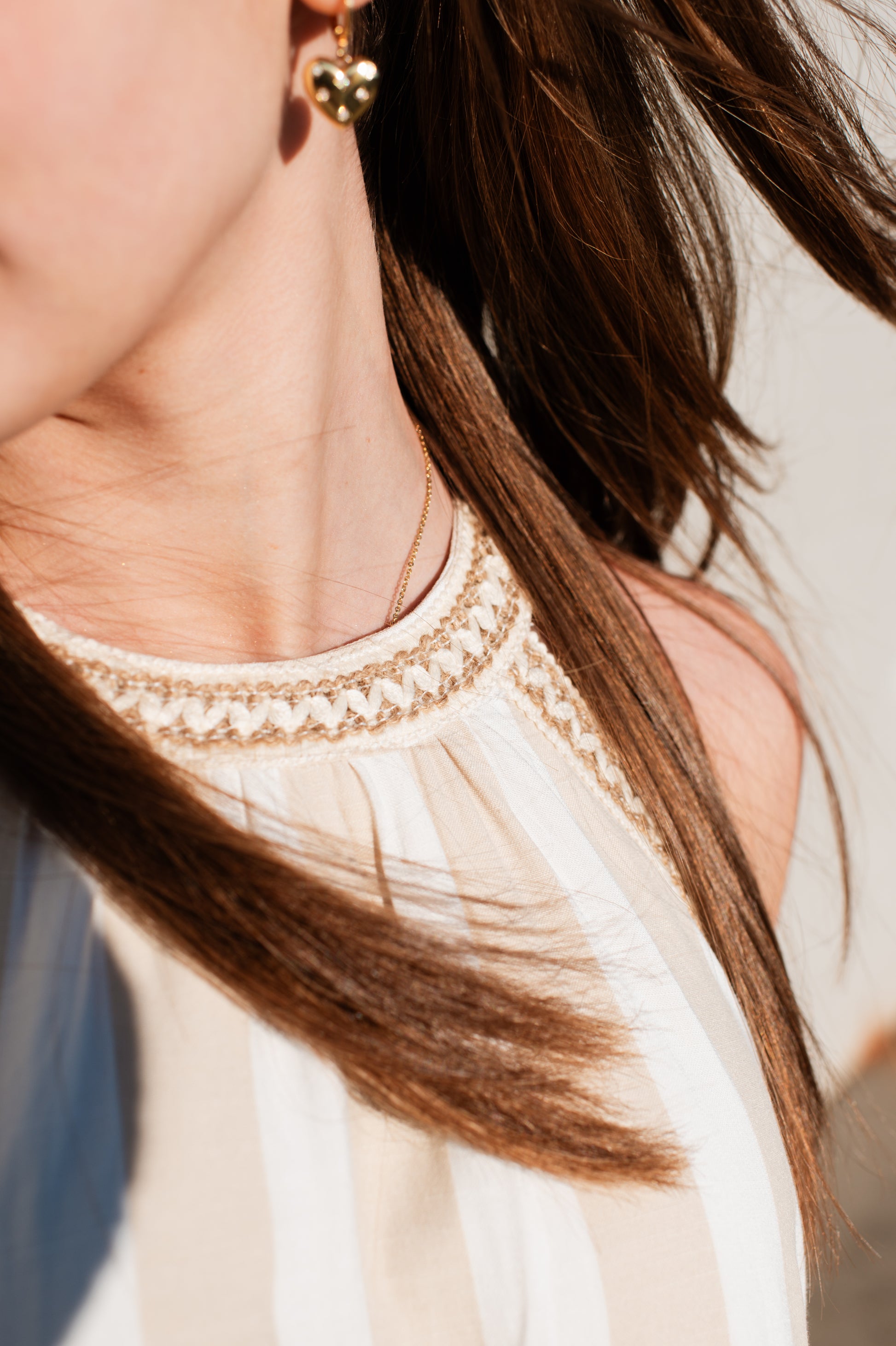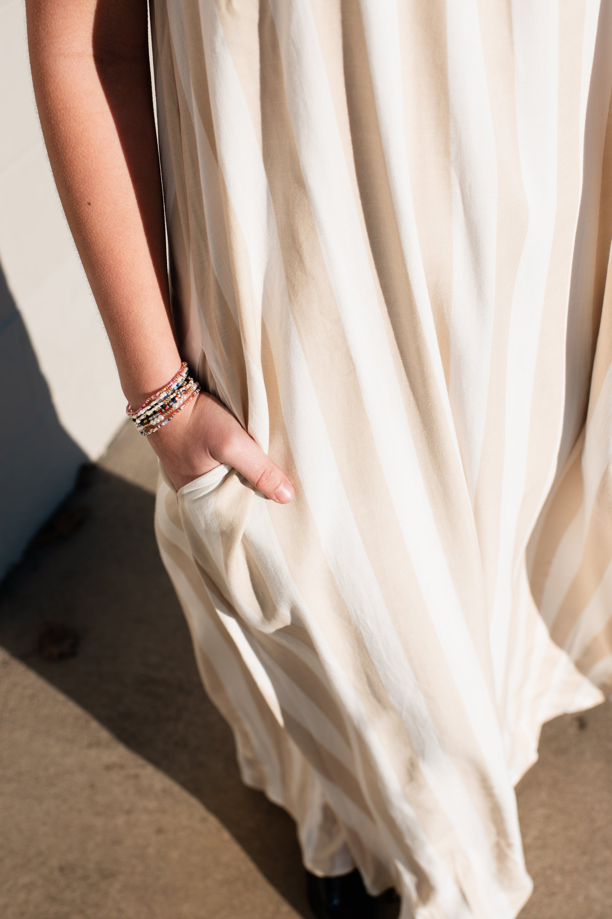 The Andrea Maxi Dress combines timeless elegance with modern sophistication. This full-length silhouette features a refined high neckline adorned with an intricate braided applique detail that draws the eye upward. Comfortable tank top sleeves provide easy movement while maintaining a polished look. The classic tan and off-white vertical stripe pattern creates a slimming effect and pairs effortlessly with your existing wardrobe. Perfect for elevated everyday wear or special occasions, this dress delivers versatile style that works season after season.