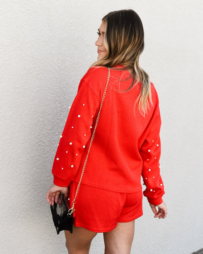The Callie Set Skort features a vibrant red hue adorned with elegant pearls across the front, creating a refined statement piece ideal for game days and holiday gatherings. Its versatile design allows for effortless styling alone or paired with tights to suit cooler days, blending sophistication with festive charm.