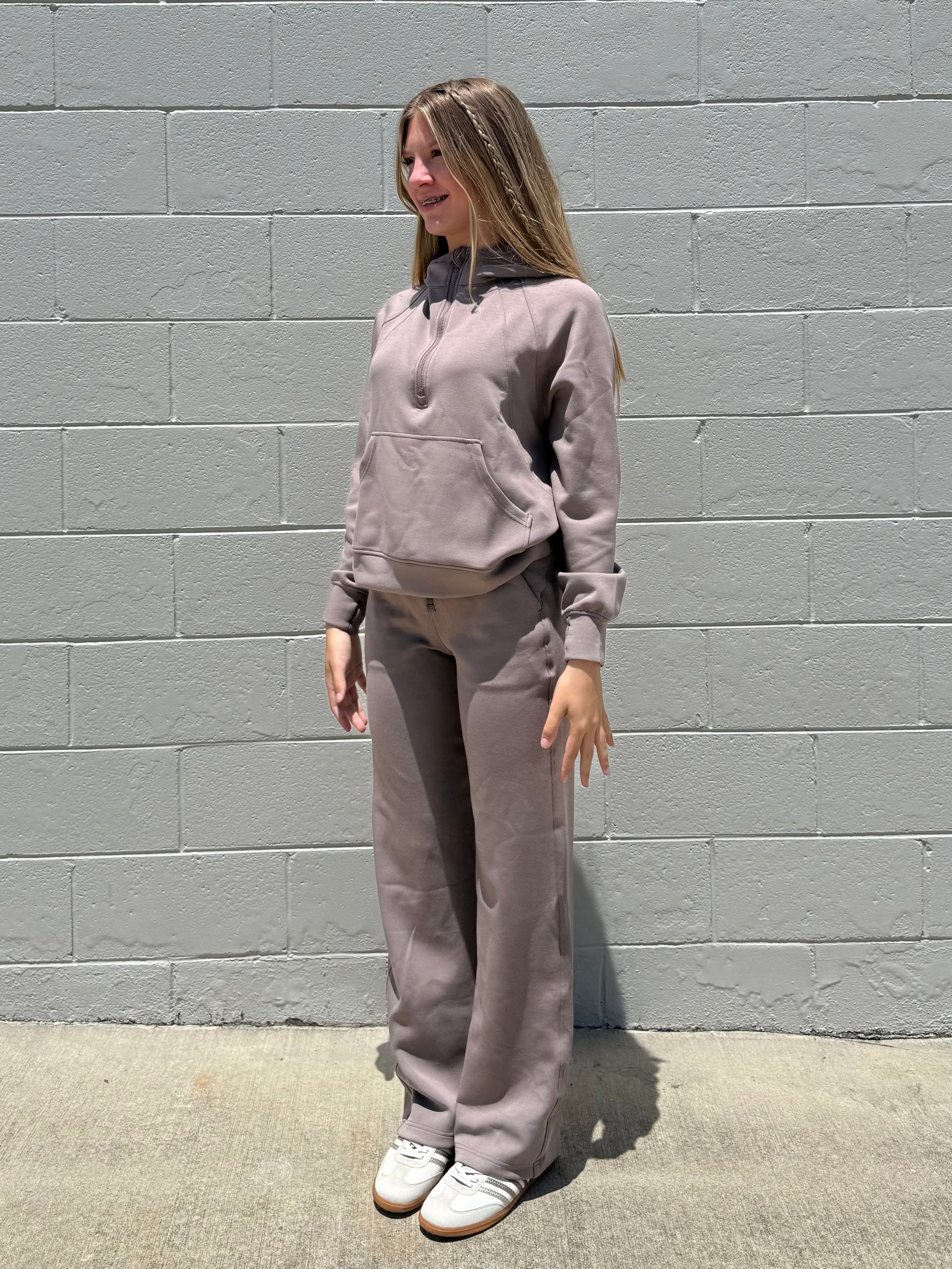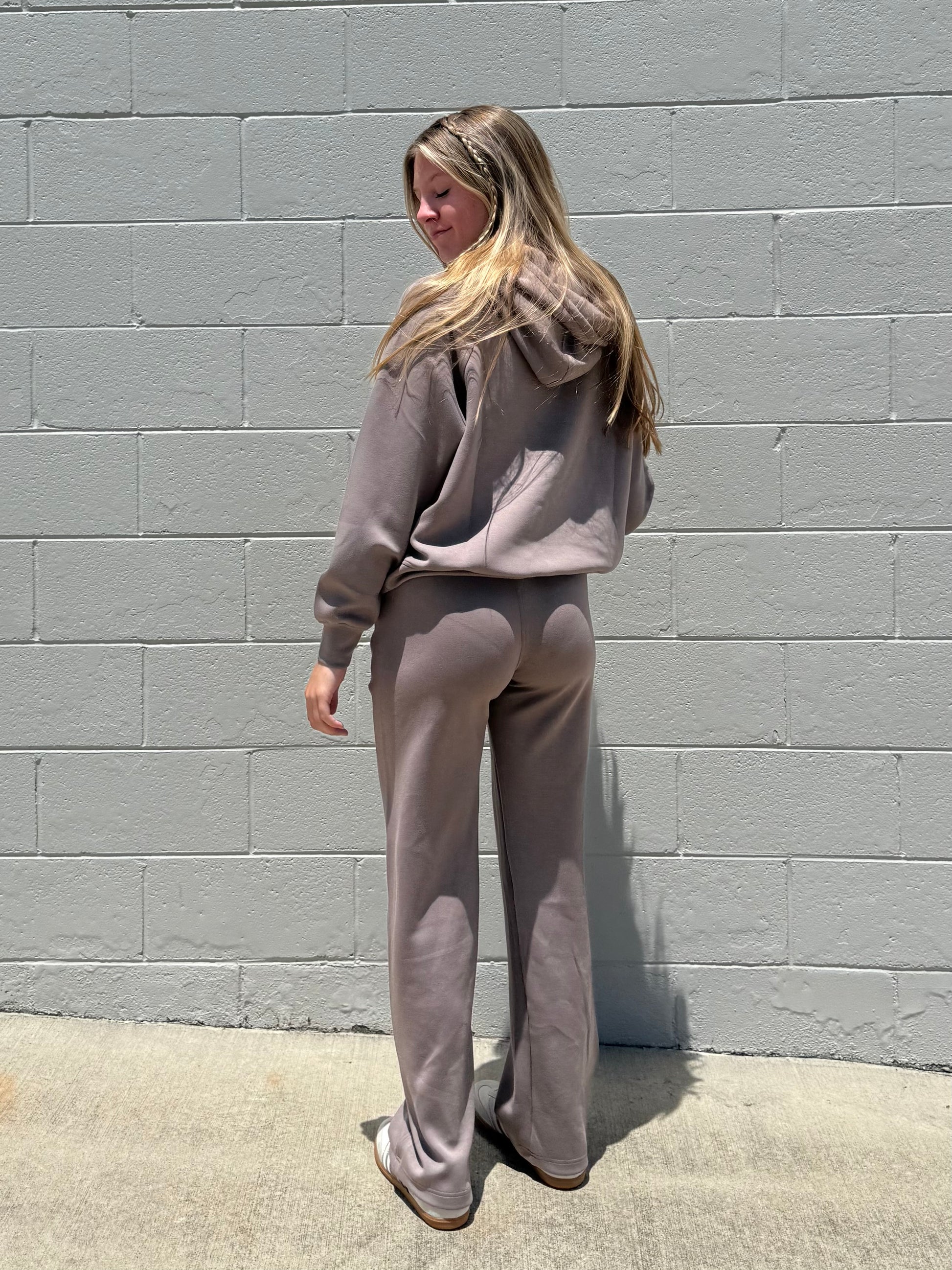 Elevate your athletic wardrobe with our Camile Set Pant. Crafted from soft taupe scuba material, these flare sweatpants feature a drawstring waistband and convenient pockets. Perfect for both exercising and lounging in luxury.