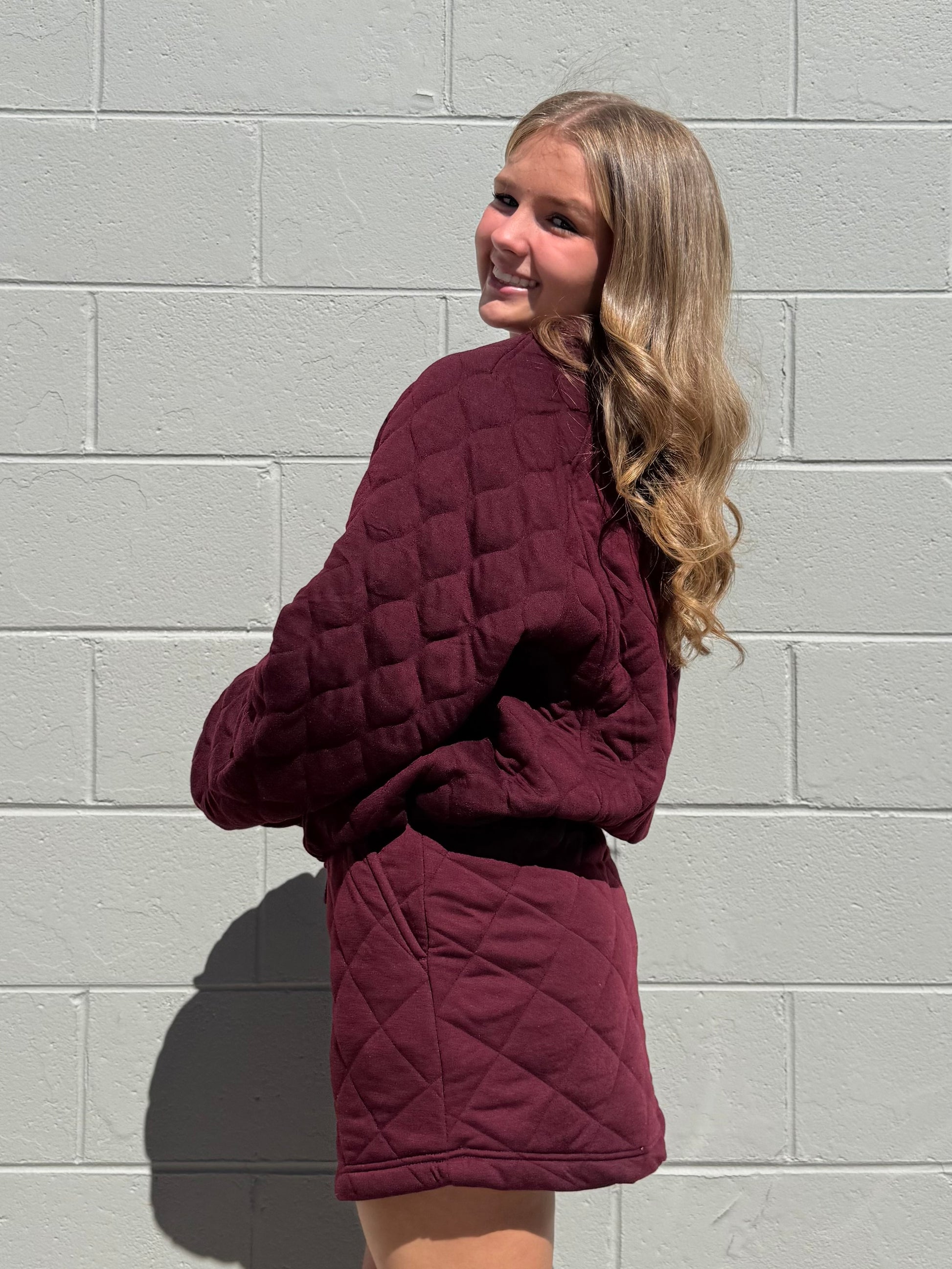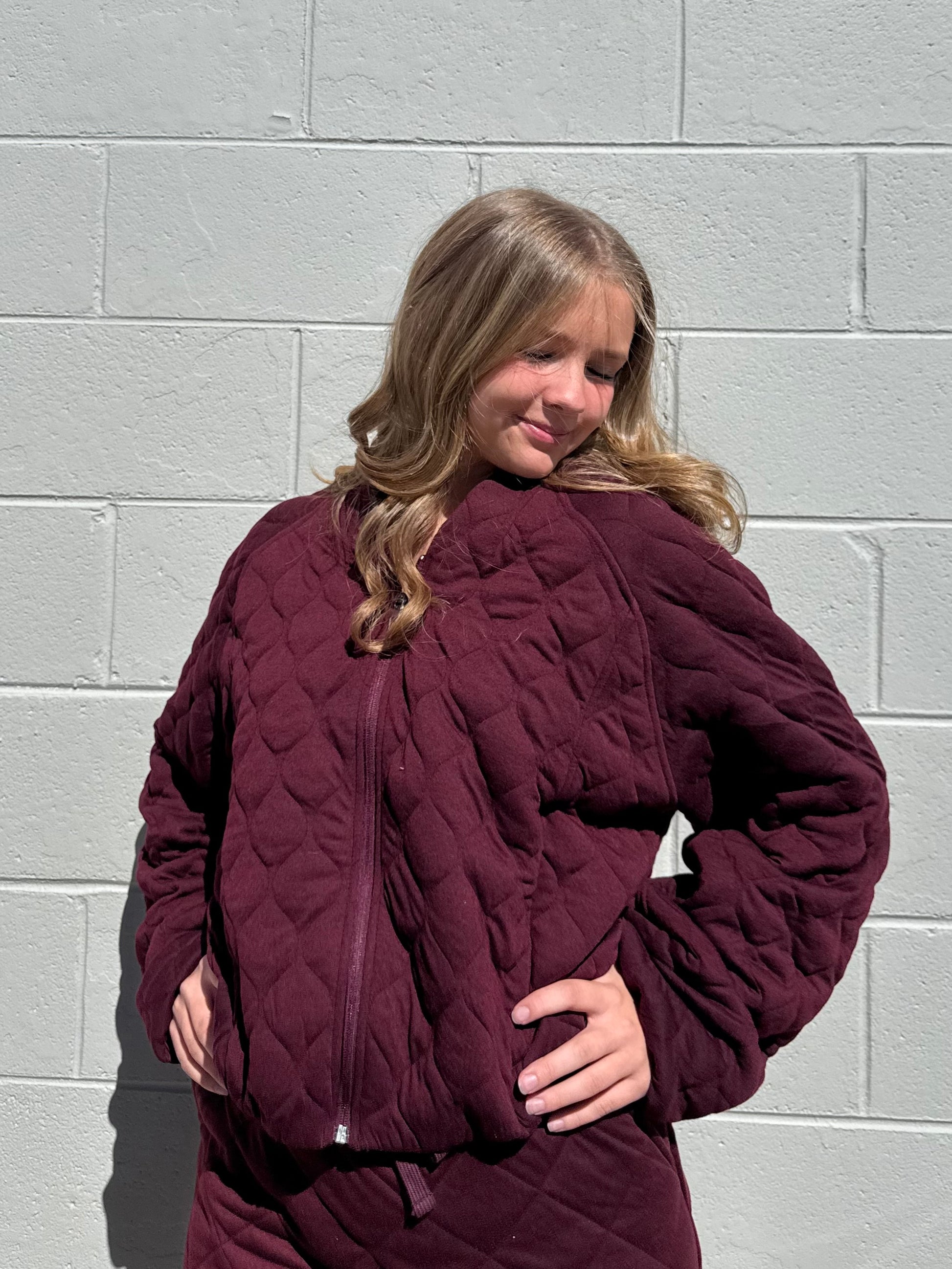 The Cherish Set Jacket features a pillowy-soft quilted fabric in a rich dark cherry red, combining warmth with lightweight comfort. Its bubble-shaped silhouette and relaxed fit create an effortlessly elegant profile, while the waist to mid-length cut adds versatility to your wardrobe. Thoughtfully designed with side hand pockets, this jacket pairs refined style with practical ease.