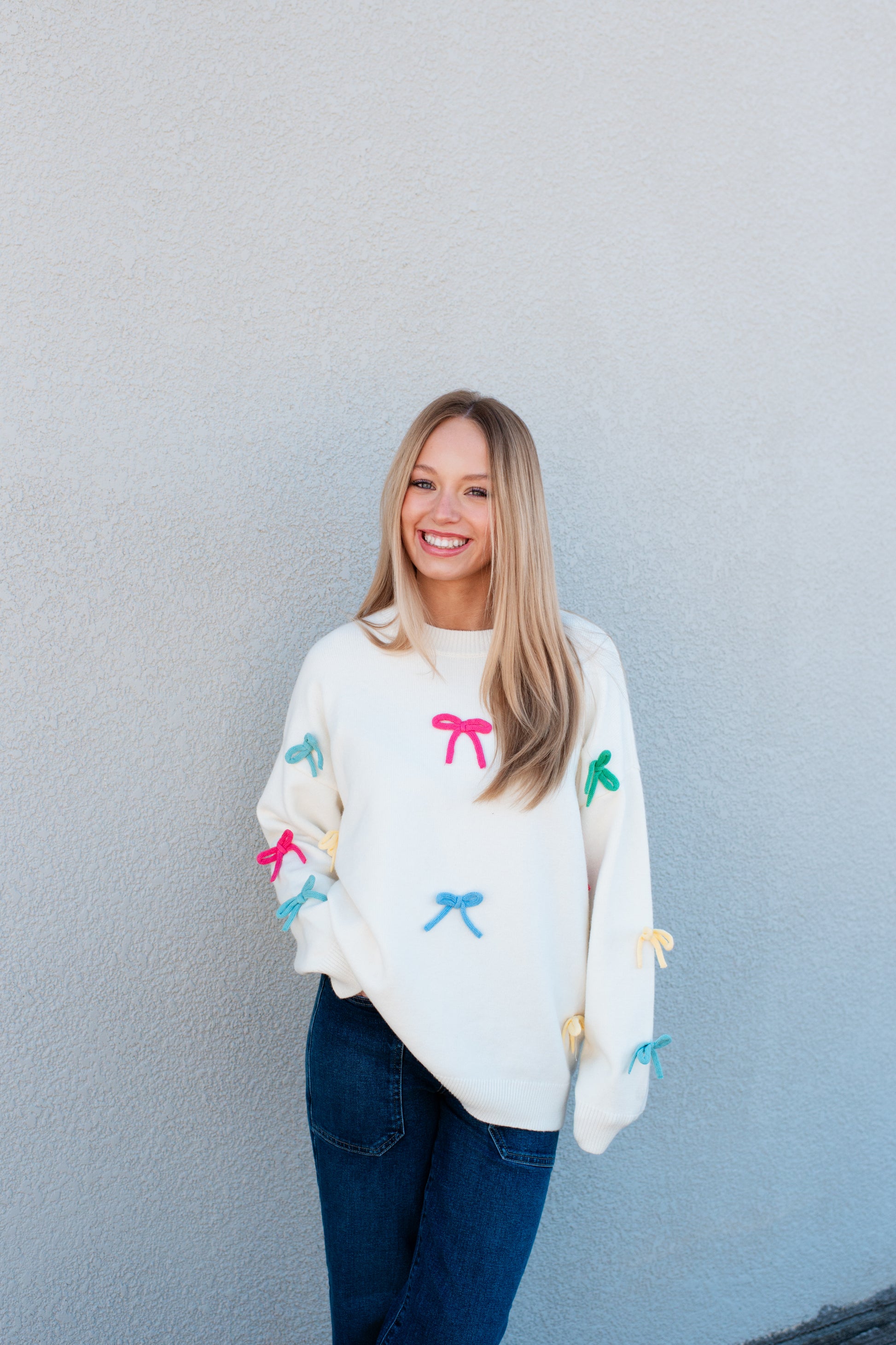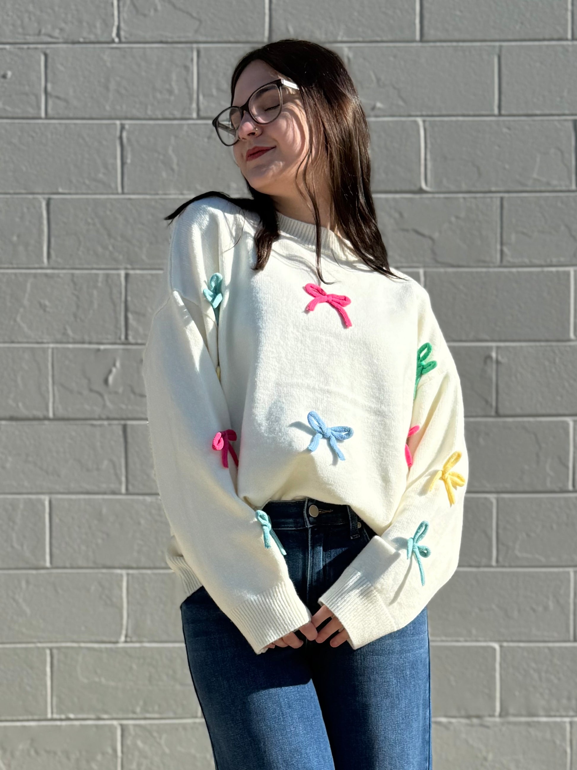 Indulge in luxury with the Claire Bow Sweater. Made from super soft material, this oversized cream sweater features playful bows in pink, blue, yellow, and green. Stay warm and stylish with the perfect pop of color to brighten up those colder days.