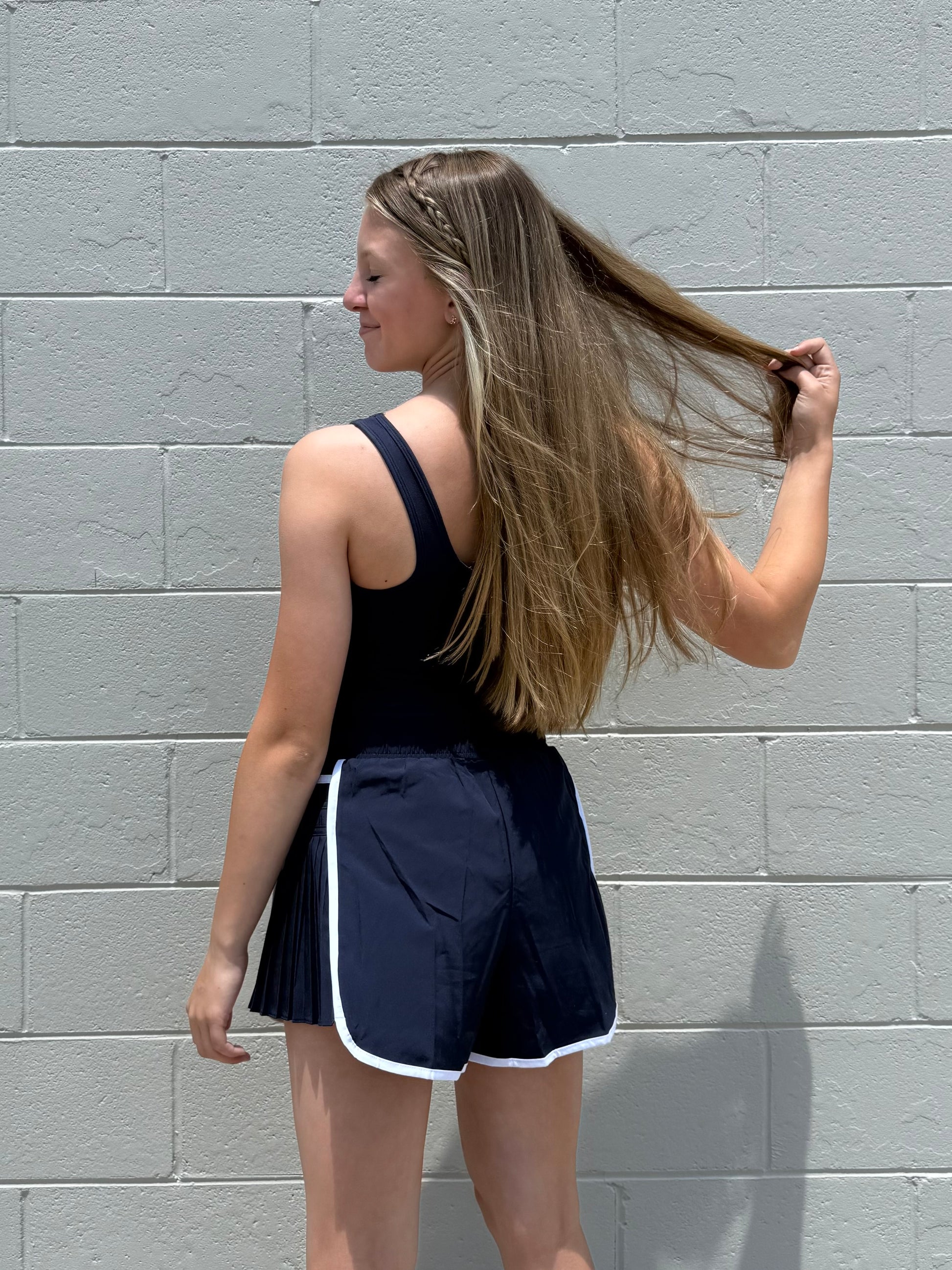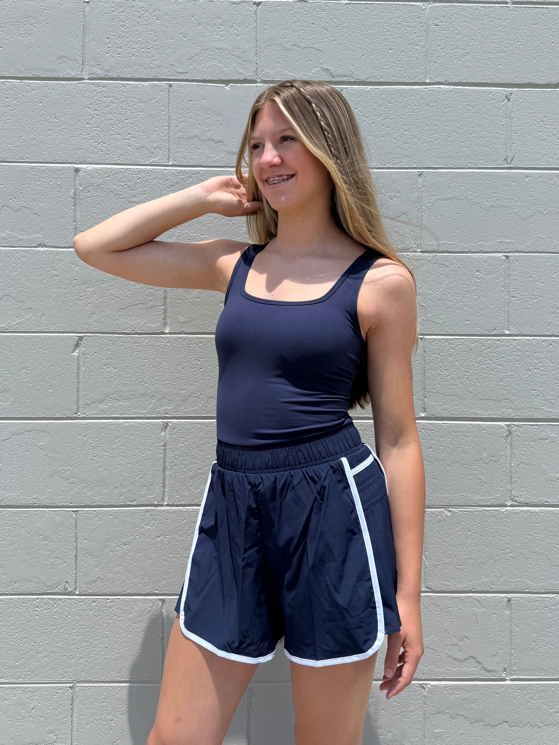 Stay comfortable and stylish with our Cypriana Athletic Romper. This navy blue and white romper features built-in shorts and a bra, making it lightweight and perfect for any workout or theme park adventure. Stay active and fashionable with this must-have piece.