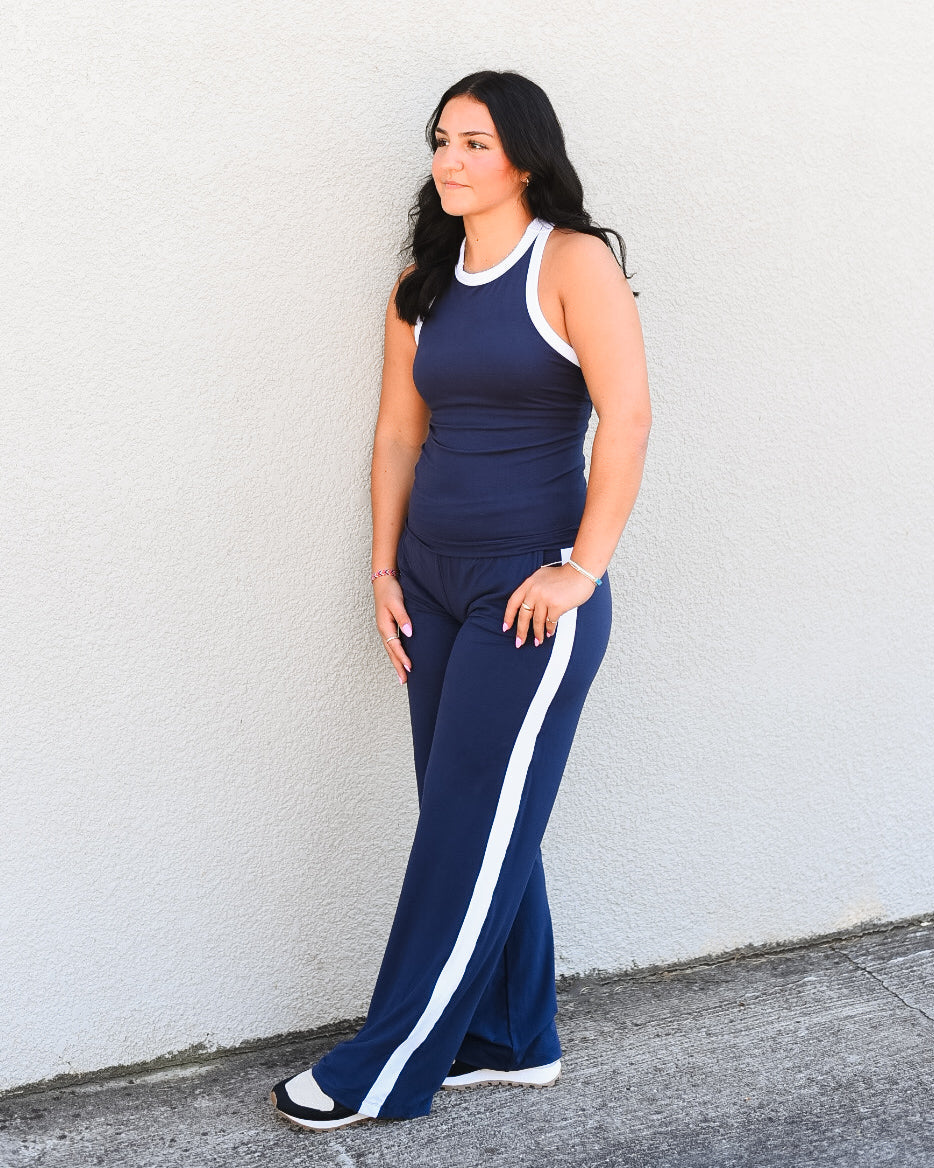 Experience ultimate comfort with the Cypriana Set Pant, crafted from super soft fabric in a rich navy blue. Featuring wide legs and elegant white detailing, these sweatpants blend relaxed style with refined design. Ideal for both lounging at home and active workouts, they offer effortless sophistication and versatility.