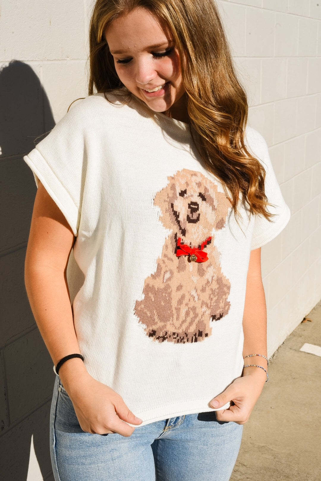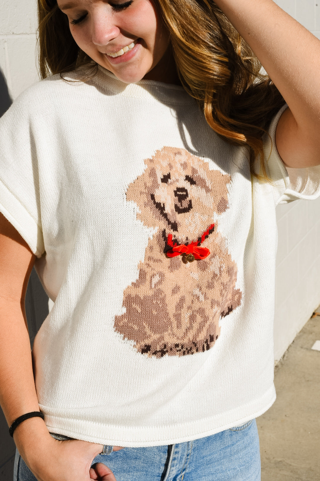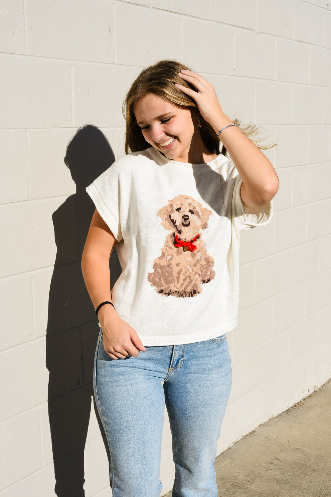 The Everlee Sweater features a refined white knit with a charming dog motif accented by a three-dimensional red bow at the collar. Its short sleeves make it versatile enough to wear alone or layered, creating a polished look perfect for game day or festive gatherings. This sweater blends subtle whimsy with elegant design, offering a sophisticated addition to your seasonal wardrobe.