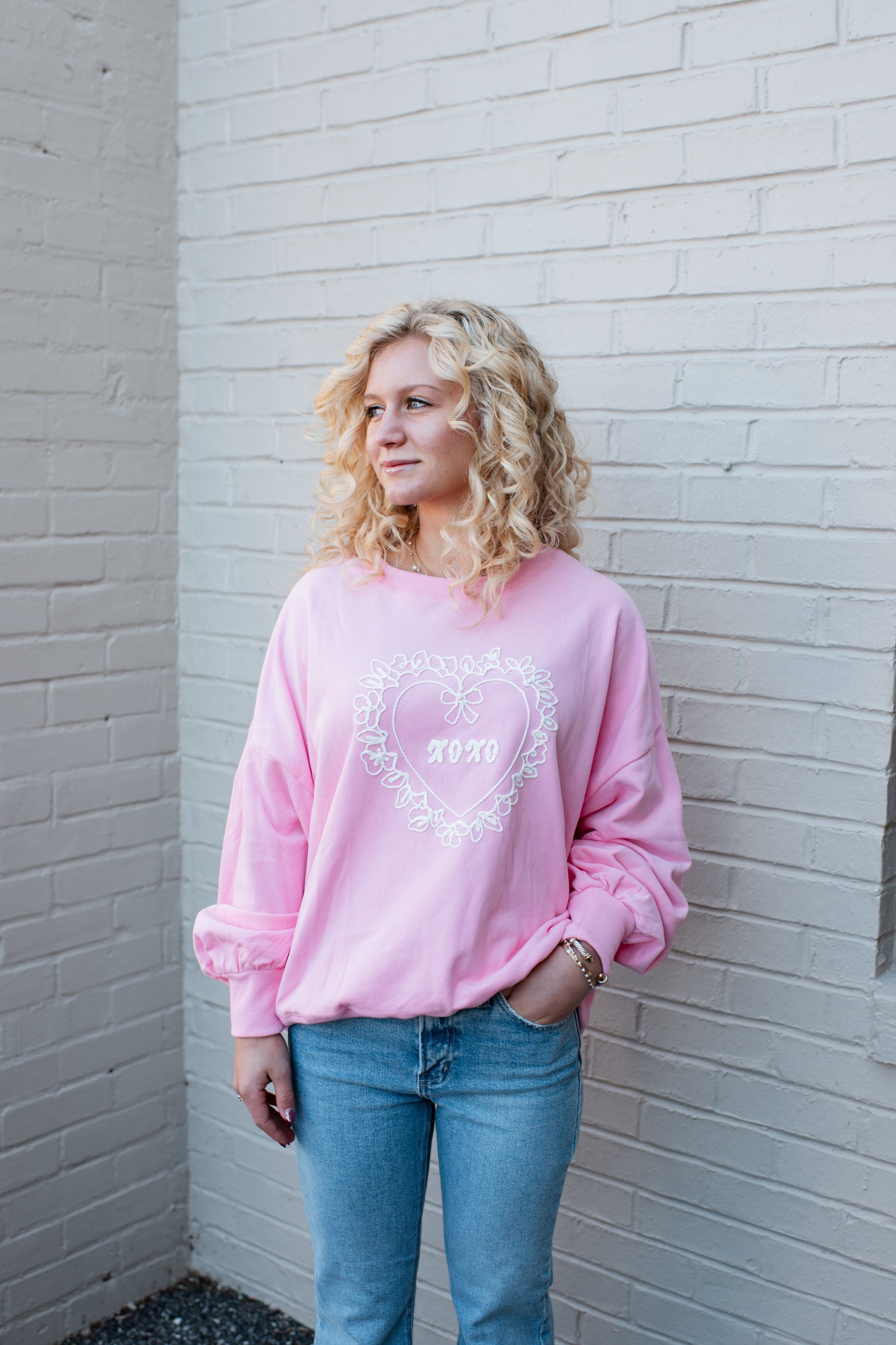 Celebrate love in style with this sophisticated pink sweatshirt, designed with delicate embroidered doily detailing. Perfect for Galentine's Day or any occasion calling for refined femininity, this piece combines comfort with understated charm. The intricate embroidery elevates any look, making it an ideal choice for those who appreciate thoughtful design details. Whether worn solo or layered, this sweatshirt brings a touch of grace to your everyday wardrobe.