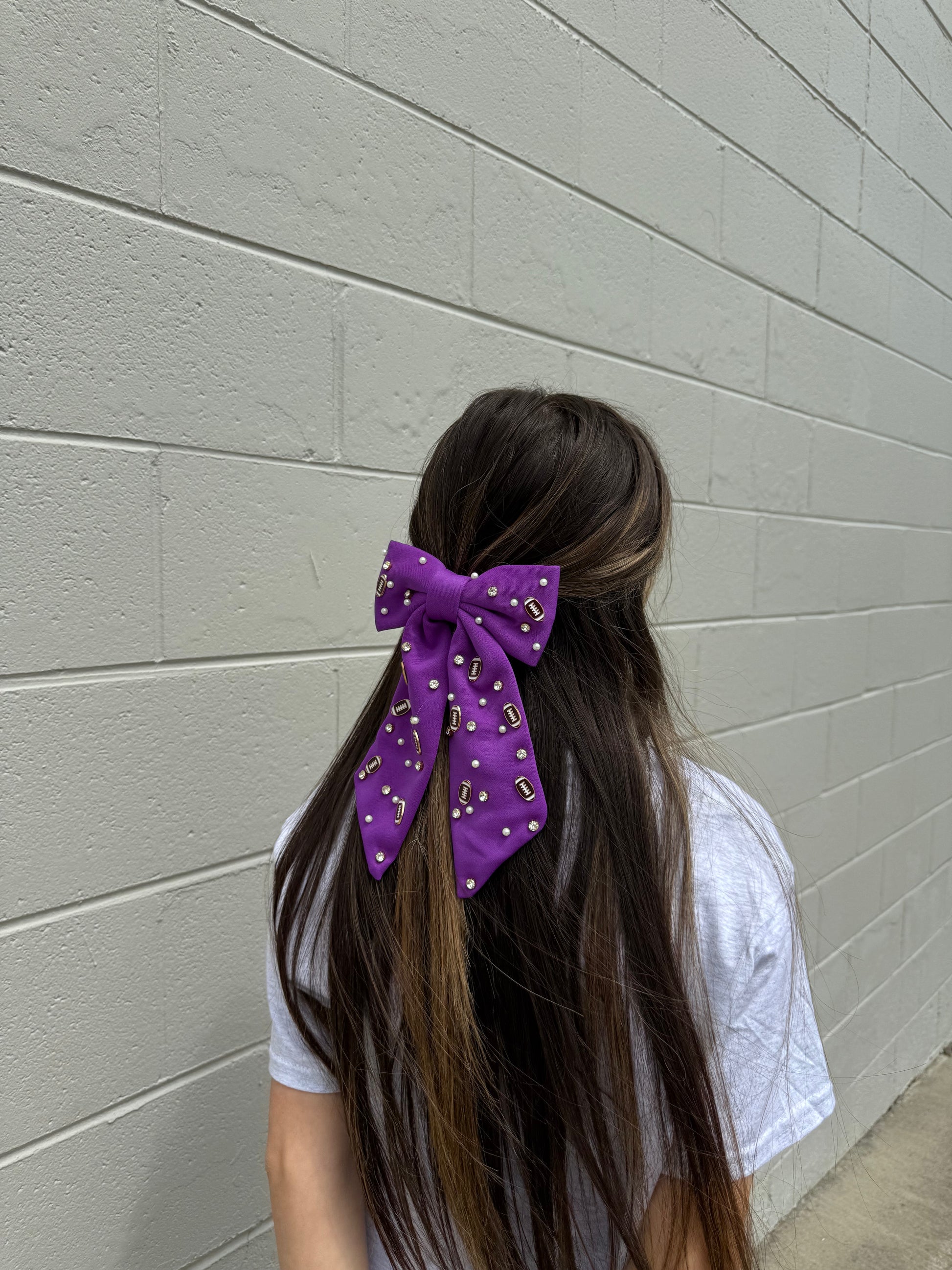 Elevate your game day ensemble with the Gameday Charm Bow, a striking polyester accessory available in rich red or regal purple. Adorned with sparkling gems and playful football motifs, this bow effortlessly blends spirited charm with refined style, making it the ideal finishing touch for any fan seeking a sophisticated yet fun look.