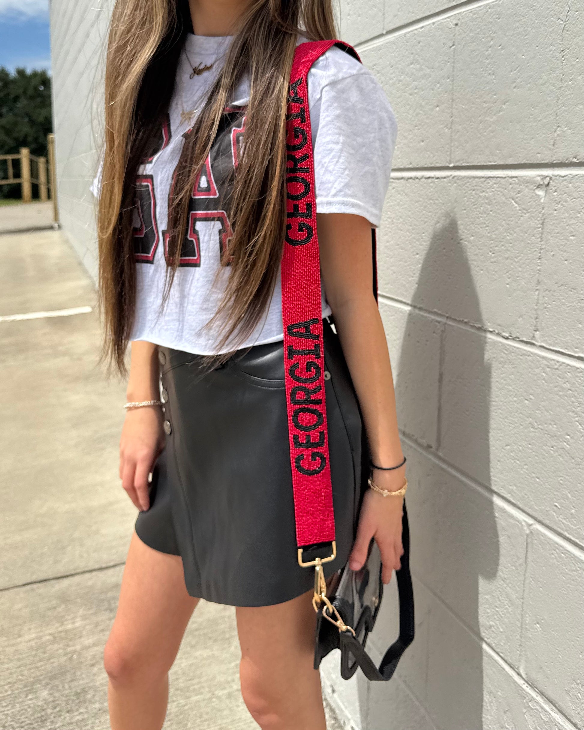 Elevate your game day look with this Georgia Beaded Bag Strap. Crafted with vibrant red beads and black beads that spell out "Georgia," it adds a refined touch to any clear bag. The reverse side features black velvet for a secure, nonslip fit, combining style and practicality seamlessly. Perfect for showing your team spirit with an elegant edge.
