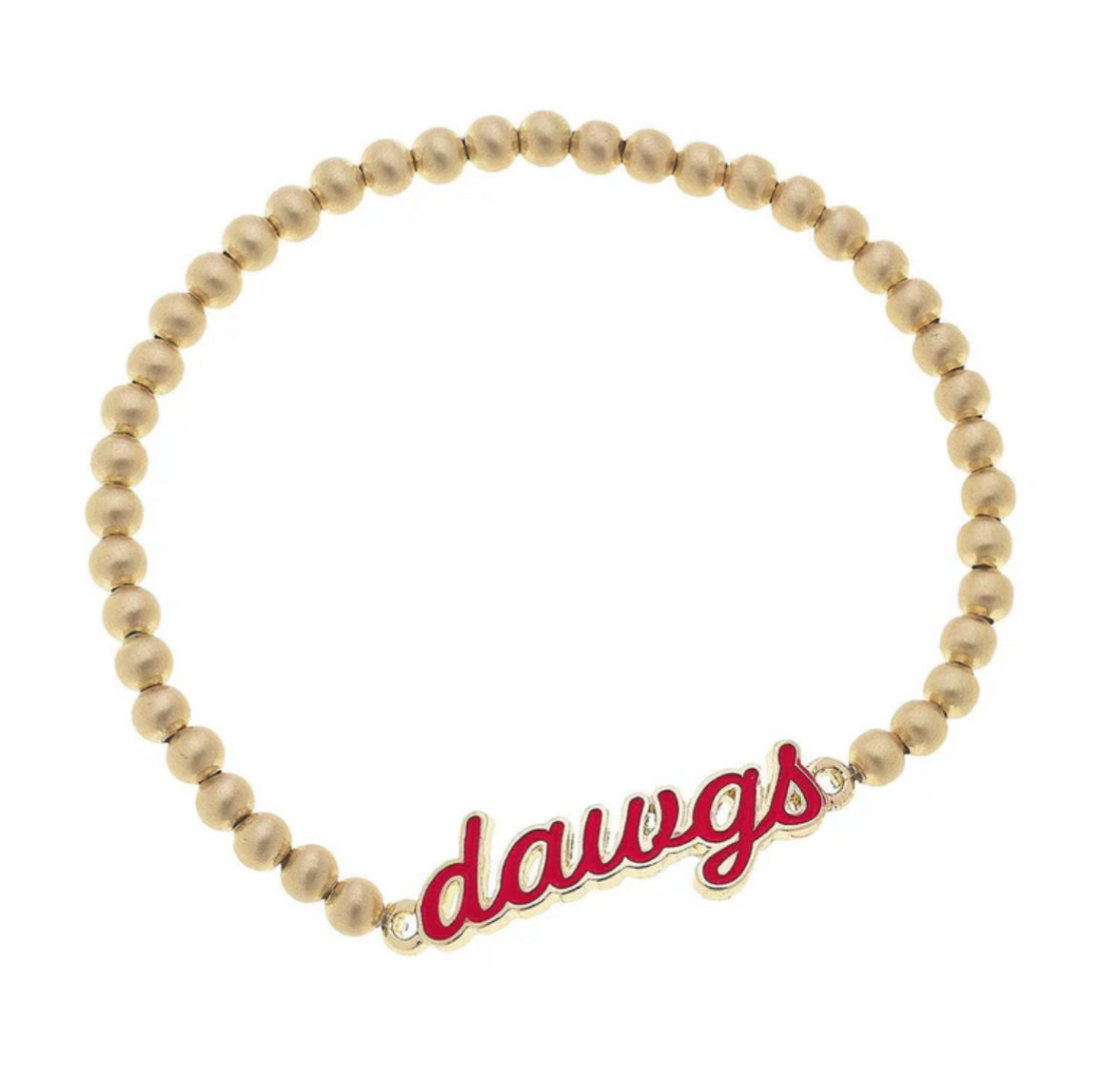 Enhance your game day look and year-round style with our Georgia Bulldogs Enamel Script Stretch Bracelet! This gold bead bracelet features a bold red script "dawgs" in the middle, adding a touch of team spirit to any outfit. Perfect for fans and fashionistas alike.