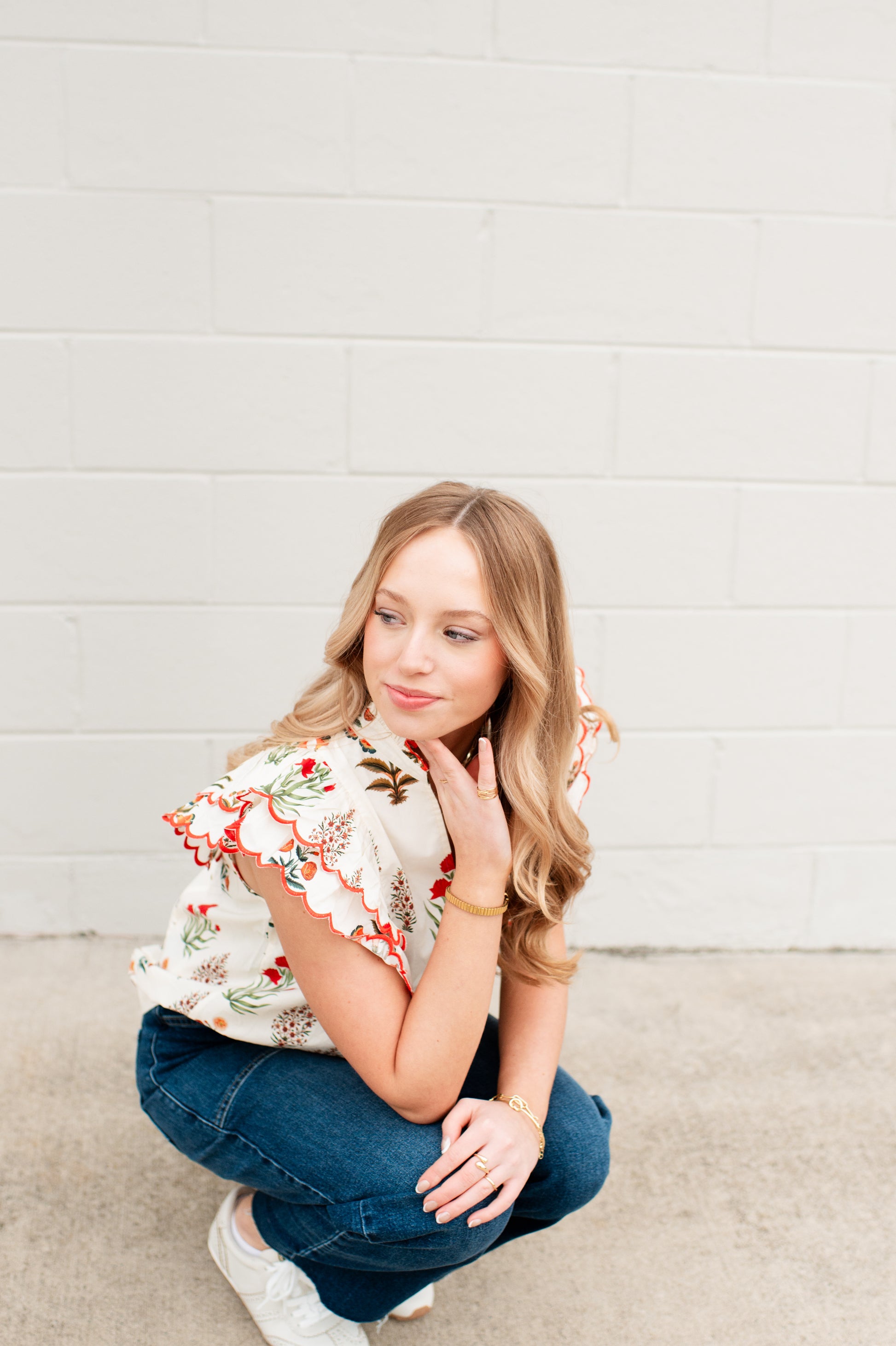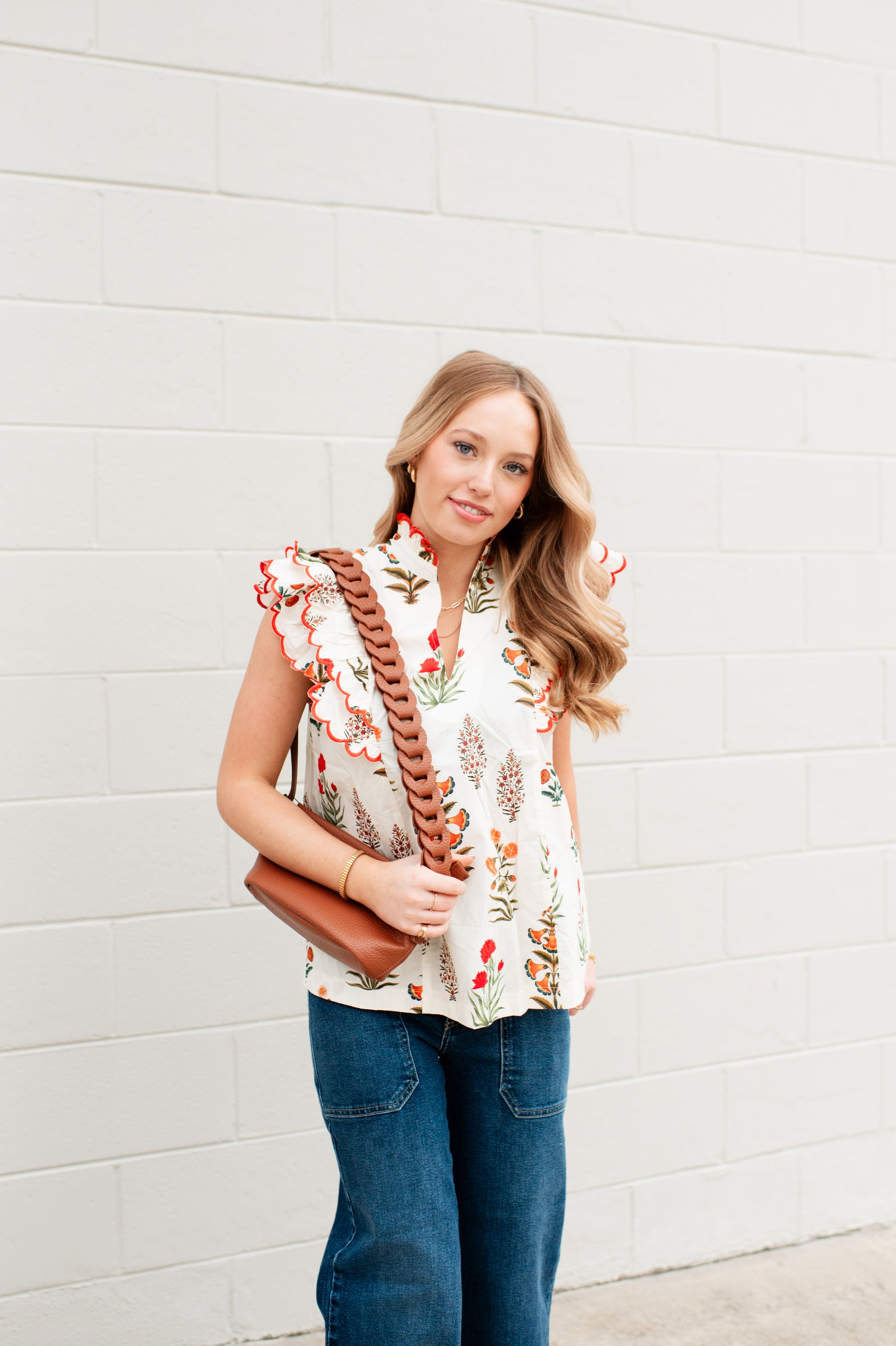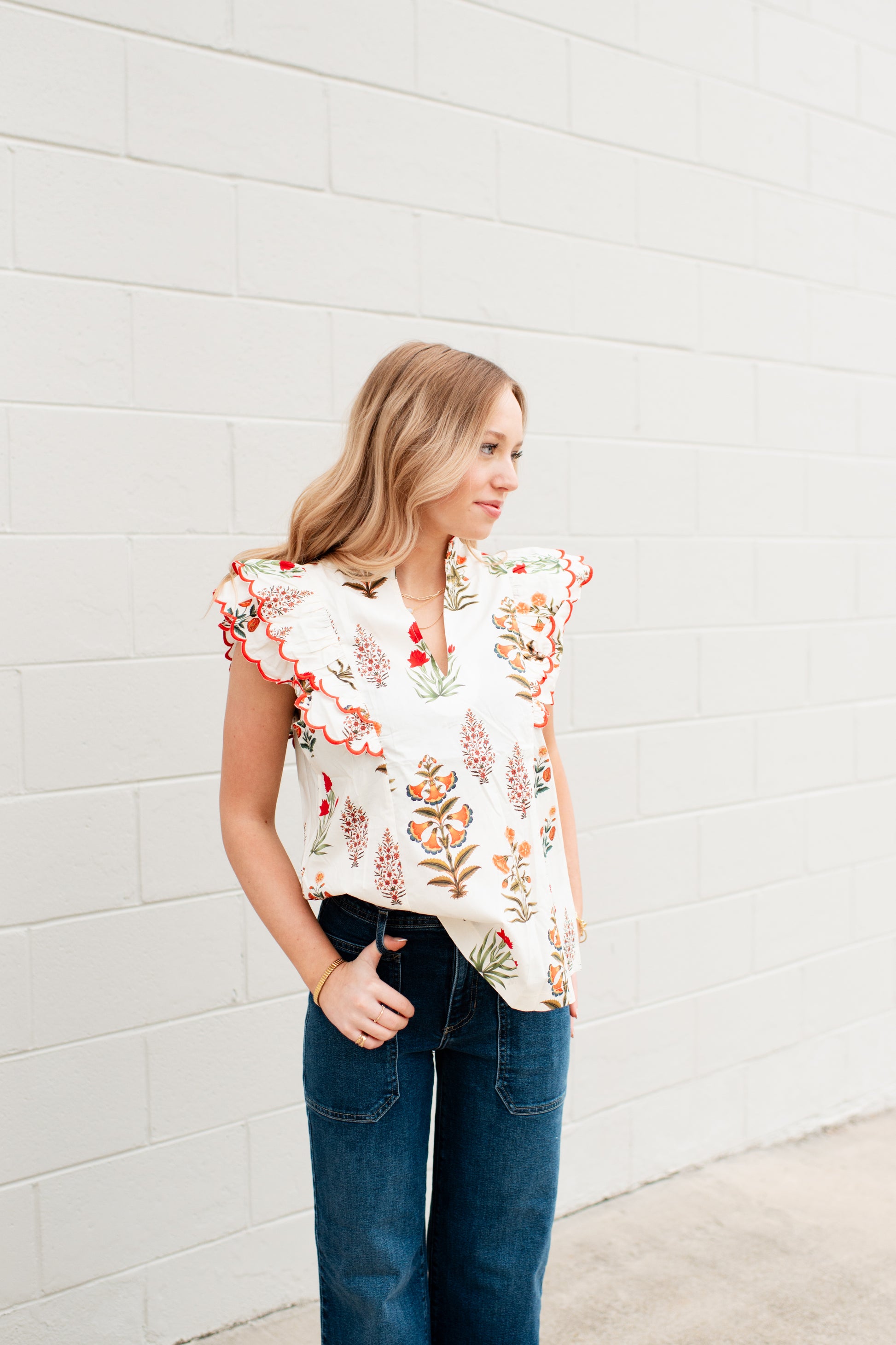 The Harmoni Top elevates your everyday wardrobe with refined elegance. Crafted in a soft cream hue, this piece features a distinctive high neck with delicate scalloped detailing that frames the neckline beautifully. Scalloped sleeves add a graceful, feminine touch while the subtle desert flower design brings understated sophistication. This top transitions seamlessly from casual to polished occasions.