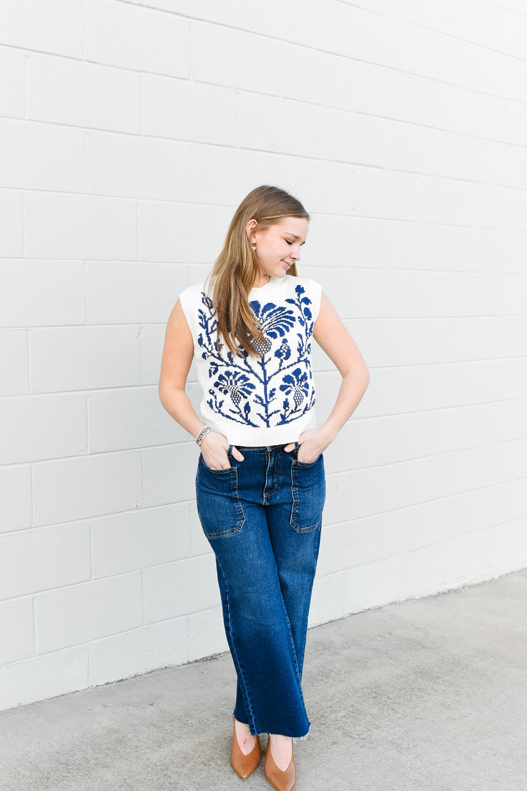 The Heritage Sweater combines timeless elegance with everyday comfort. Crafted from soft knit material, this cream vest features sophisticated navy blue design accents that elevate any wardrobe. Perfect for layering or wearing solo, it delivers versatile style for both casual outings and polished occasions. The quality construction ensures durability, while the classic color palette makes it easy to coordinate with existing pieces. A wardrobe essential that bridges seasons and trends.