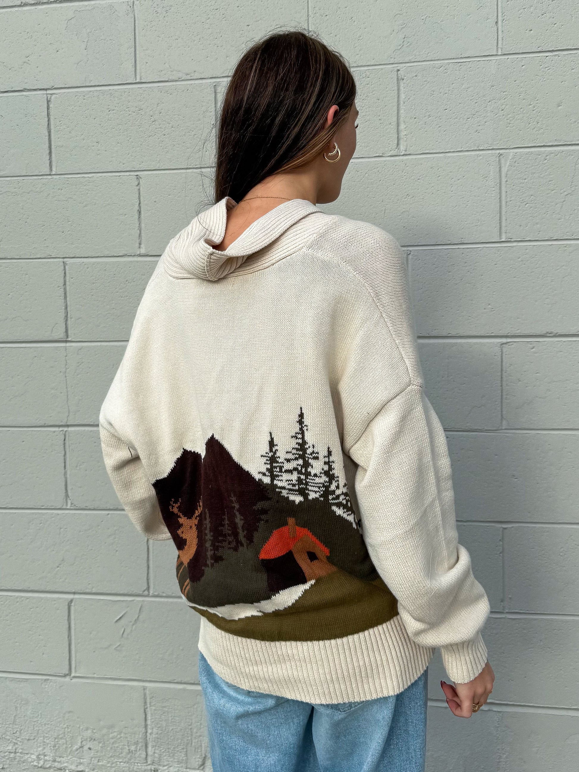 The Isabella Cardigan combines timeless elegance with seasonal charm. Crafted from thick, luxurious knit in a versatile cream hue, this piece features natural wooden buttons and practical front pockets for everyday functionality. The standout back showcases an intricate reindeer and cabin scene nestled among mountains and evergreens—a refined touch that captures the magic of winter without feeling overly festive. Perfect for layering through the coldest months, this cardigan transcends holiday dressing to become a cherished staple in your winter wardrobe.