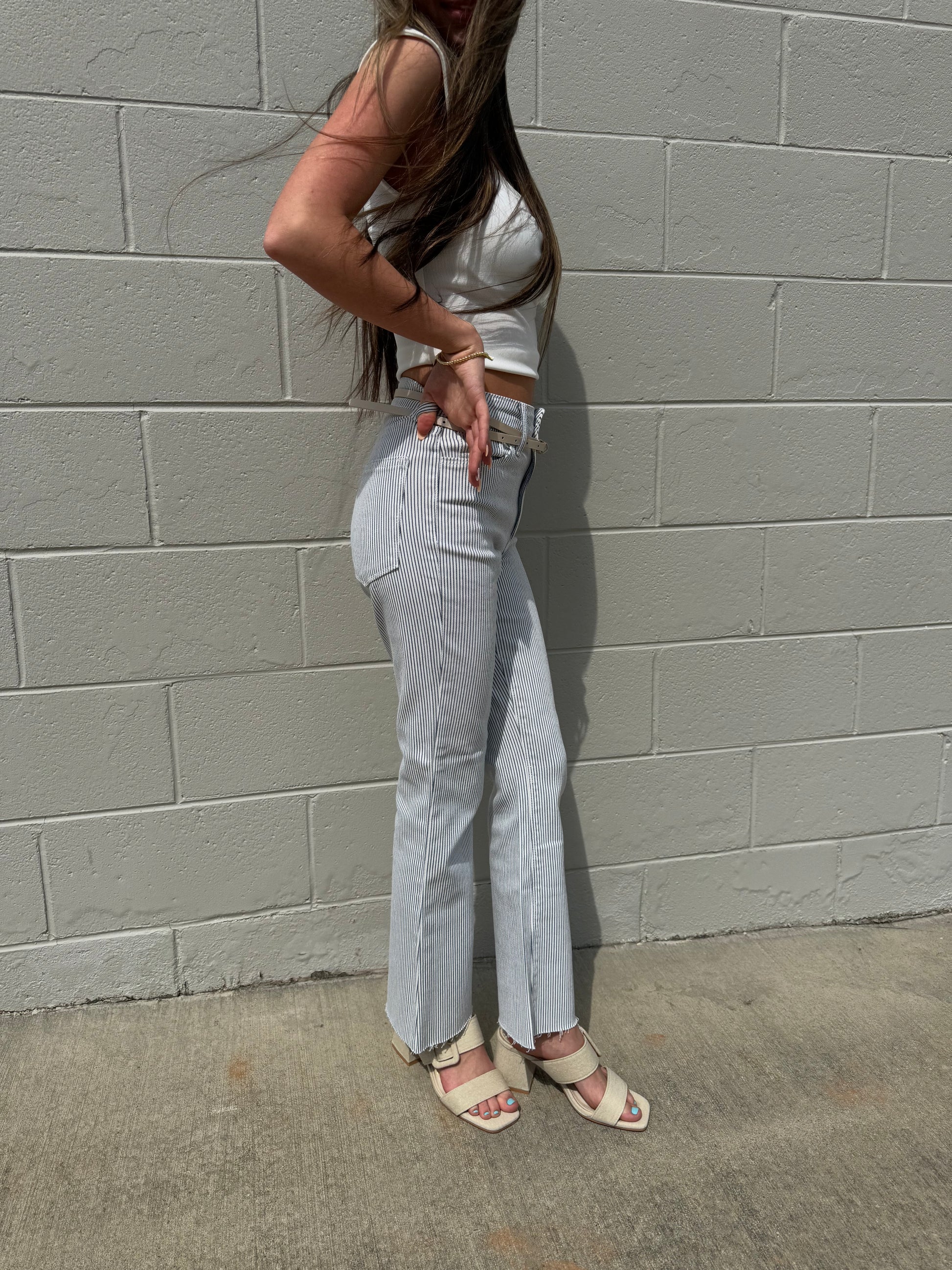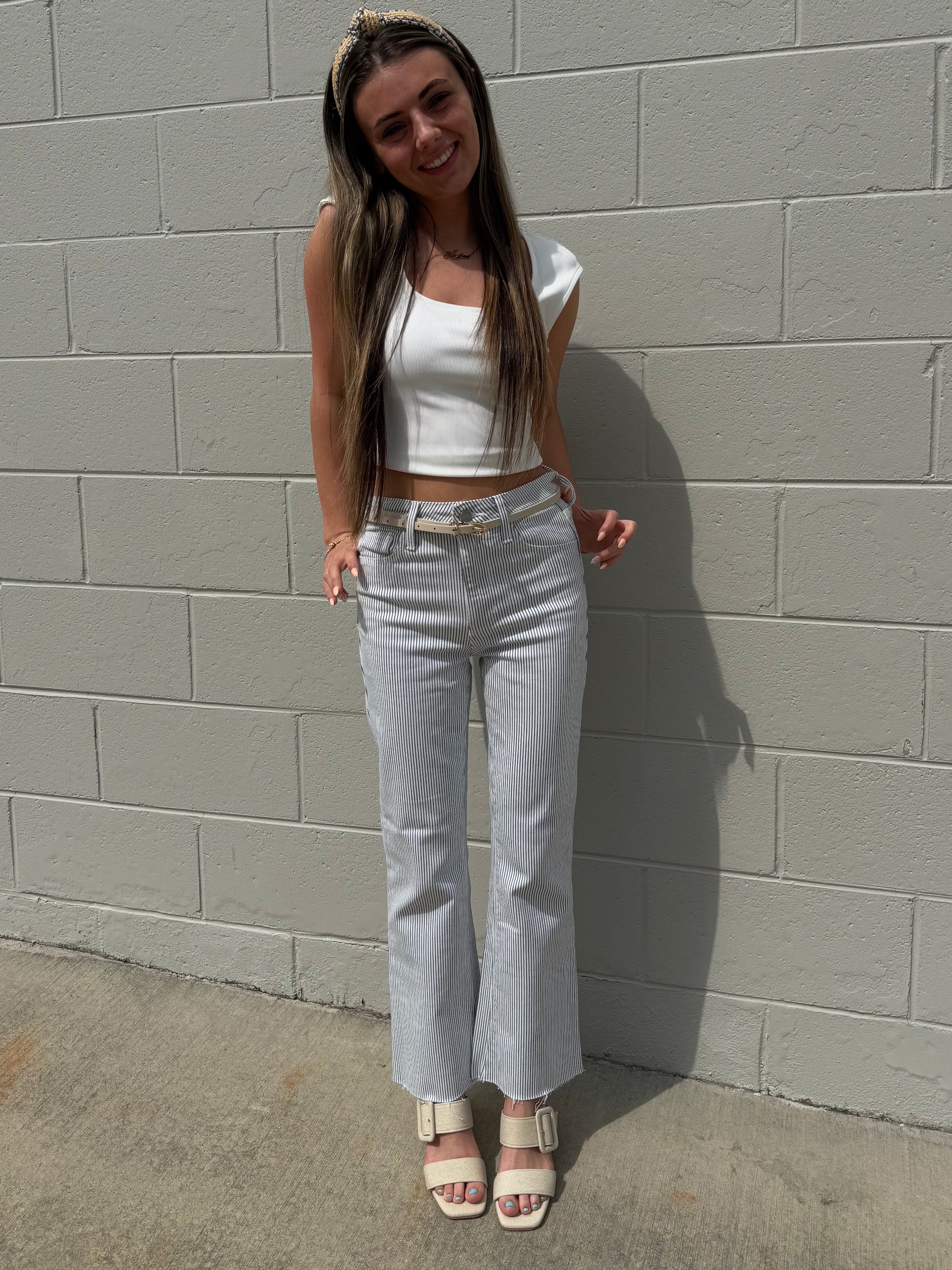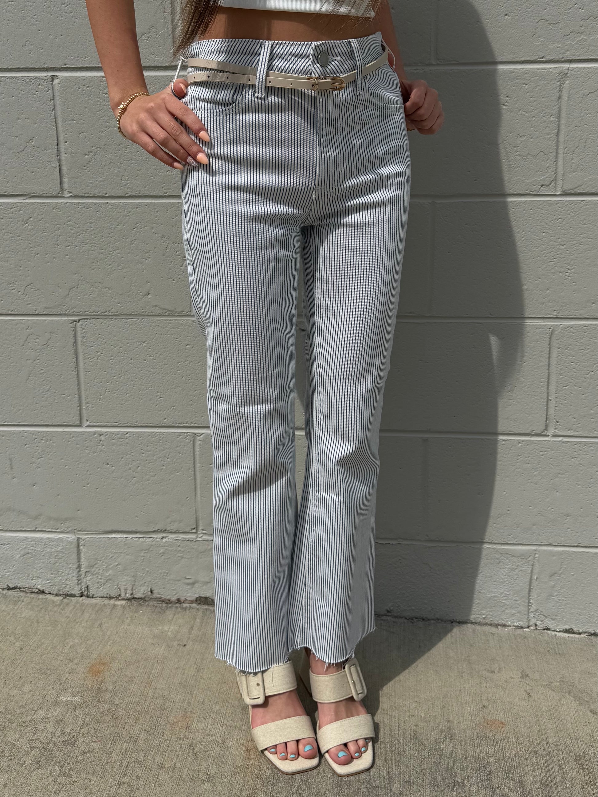 Elevate your denim game with our JBD HR Tonal Crop Flare Striped Jeans. Featuring a crisp white and blue pinstripe pattern, these jeans add a touch of sophistication to any look. The raw edge detailing adds a unique, artistic touch to this classic silhouette. These jeans can be styled for an edgy or preppy look!