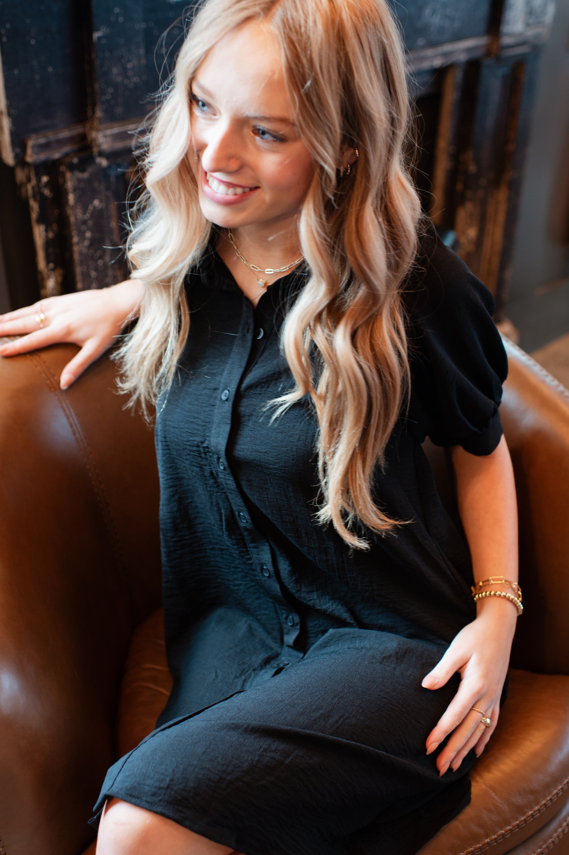 The Jude Mini Dress combines timeless elegance with modern edge. This striking black piece features a high neckline and classic collar that frame your face beautifully, while buttons running the full length add visual interest and versatile styling options. Wear it buttoned for polished sophistication or partially unbuttoned for an effortlessly chic look. The mini silhouette flatters your figure while the structured neckline keeps the style refined and wearable for any occasion—from casual outings to evening events.