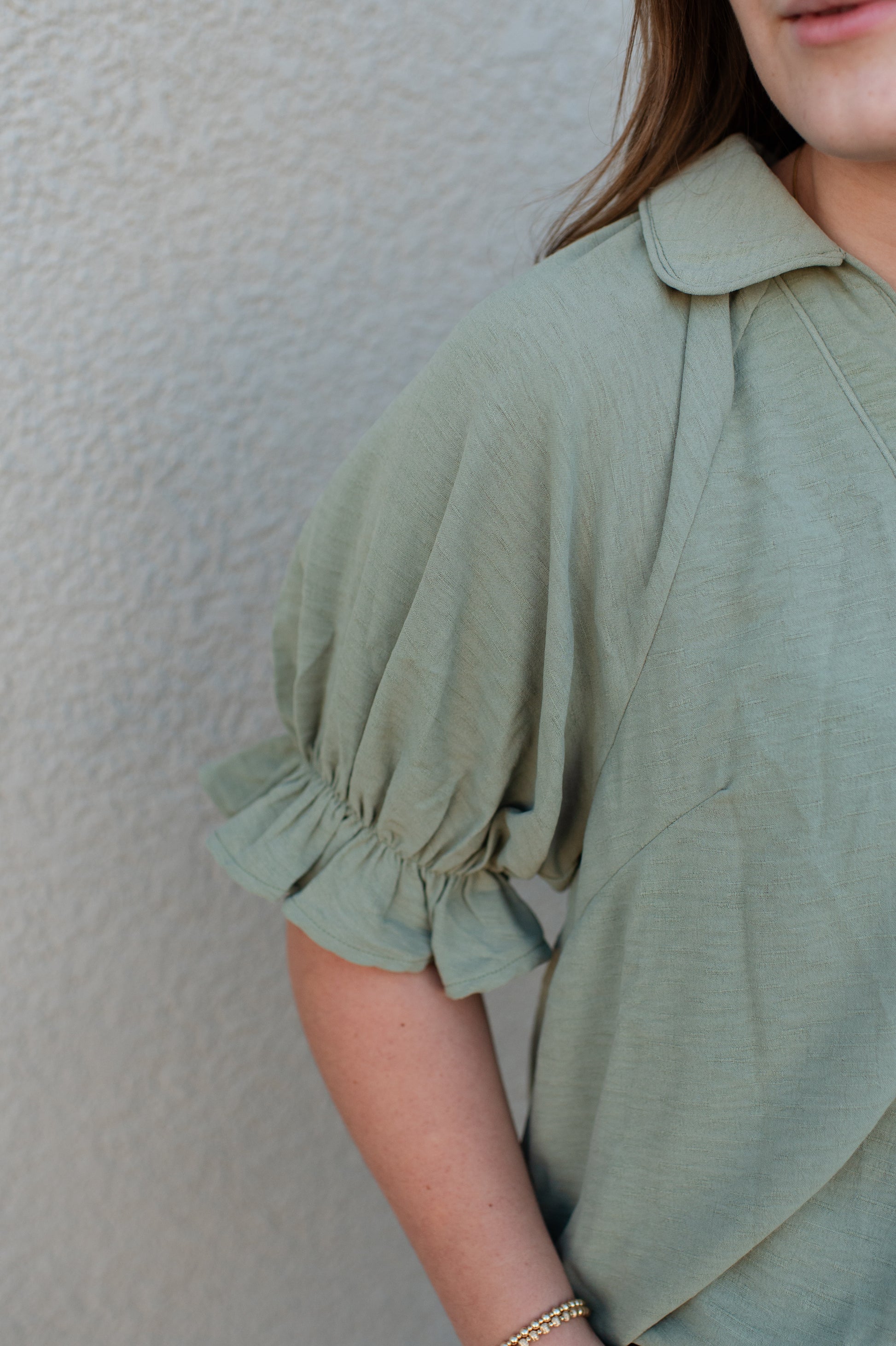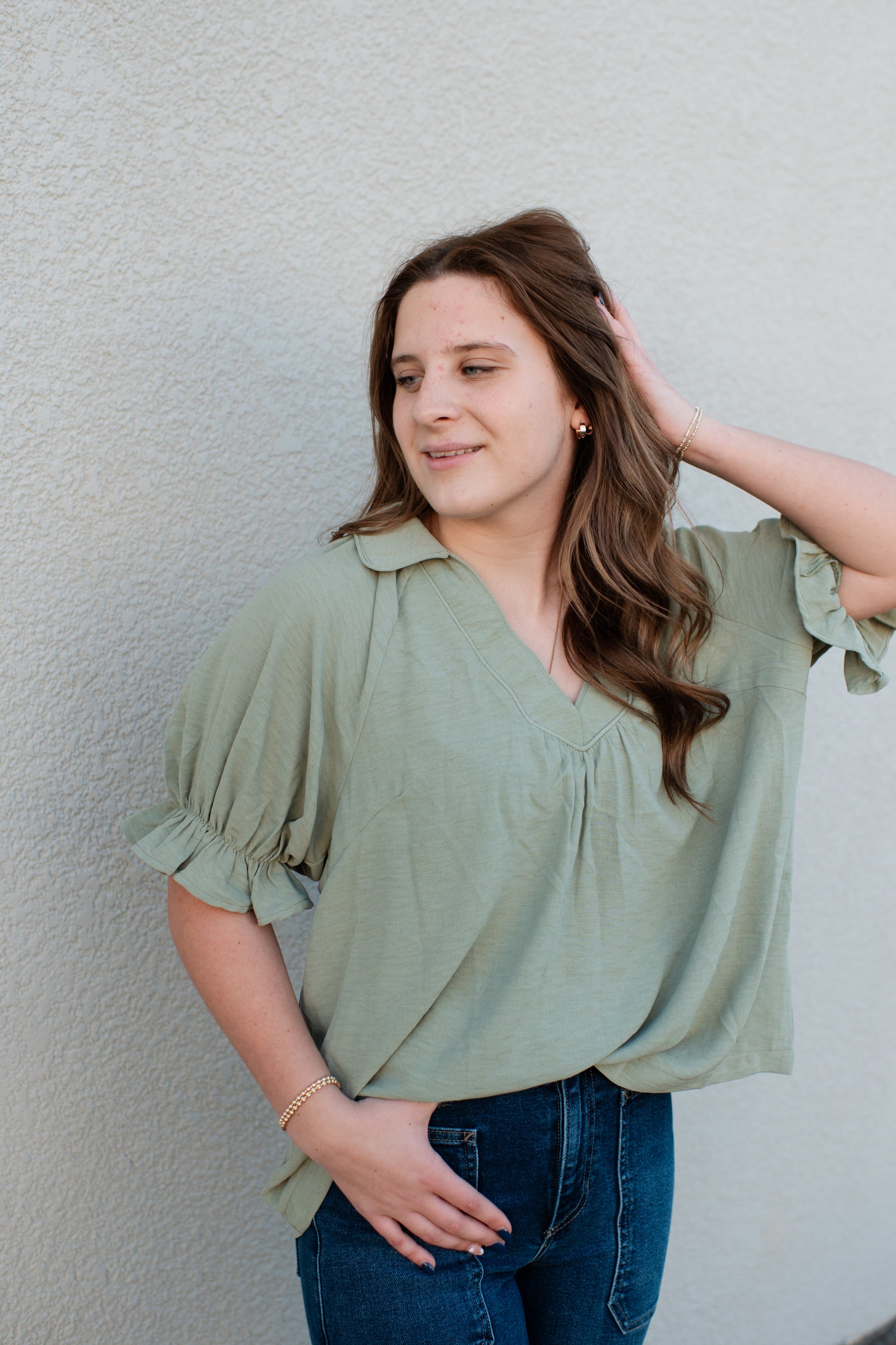 The Kahya Top brings effortless elegance to your everyday wardrobe. This sophisticated green v-neck blouse features delicate ruffled sleeves that add movement and visual interest, while the relaxed loose fit ensures all-day comfort without compromising style. A seamless transition from office to weekend occasions.