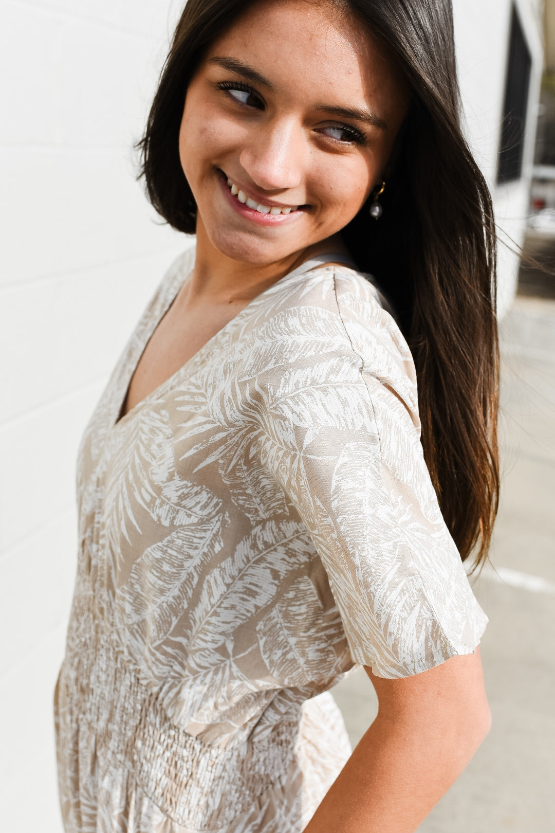 Effortlessly chic and undeniably comfortable, the Kristen Jumpsuit brings tropical-inspired style to your everyday wardrobe. This beige base features striking white botanical outlines of palm leaves and trees, creating an eye-catching design that feels fresh and modern. The flattering V-neckline and ruched waistband define your silhouette beautifully, while short sleeves keep things breezy. Flowy legs with calf-level slits offer movement and breathability, making this piece perfect for warm weather adventures or casual outings. One piece, endless styling possibilities—this is the jumpsuit you'll reach for again and again.