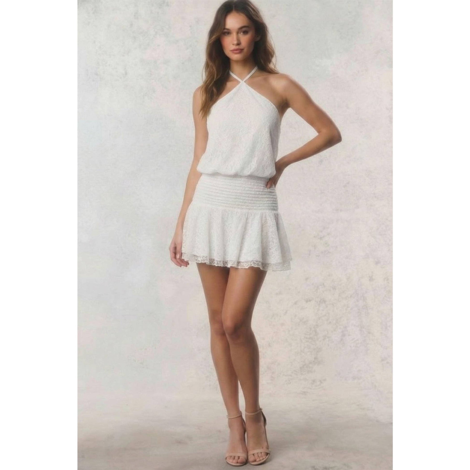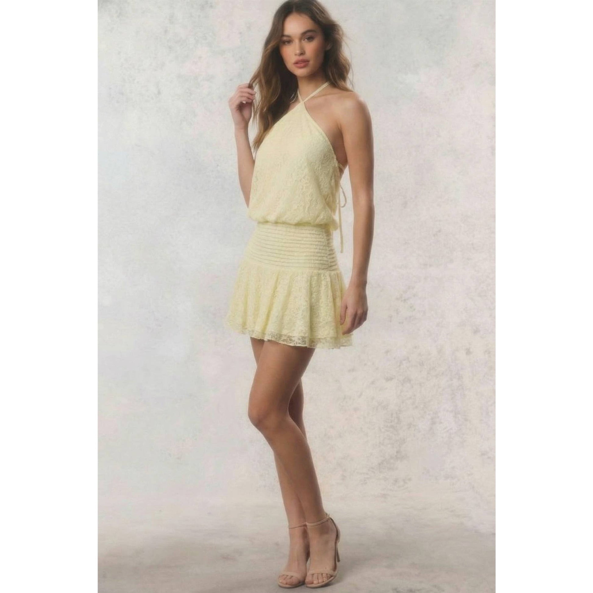 The Late Night Martini Dress features a halter design and an open back, crafted from delicate yellow lace. This mini dress offers a blend of elegance and comfort, making it suitable for evening events. The breathable fabric ensures ease of movement, enhancing wearability during warm nights.