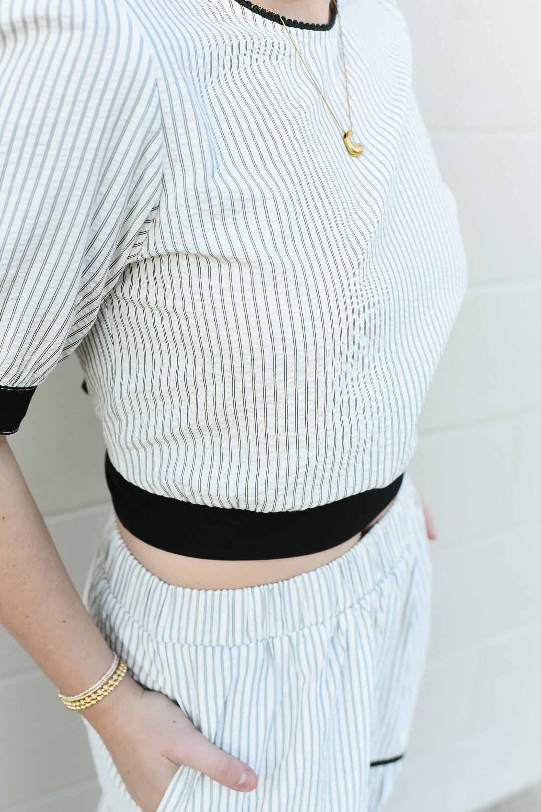 The Lindsay Top features a crisp off-white base adorned with delicate black vertical stripes that create an effortlessly chic aesthetic. A striking black band cinches the bottom with an elegant back bow, adding a touch of sophistication and allowing you to customize the fit. Perfect for layering or wearing solo, this versatile piece transitions seamlessly from casual days to evening occasions. The thoughtful design details elevate any wardrobe while maintaining the comfort and ease you deserve.