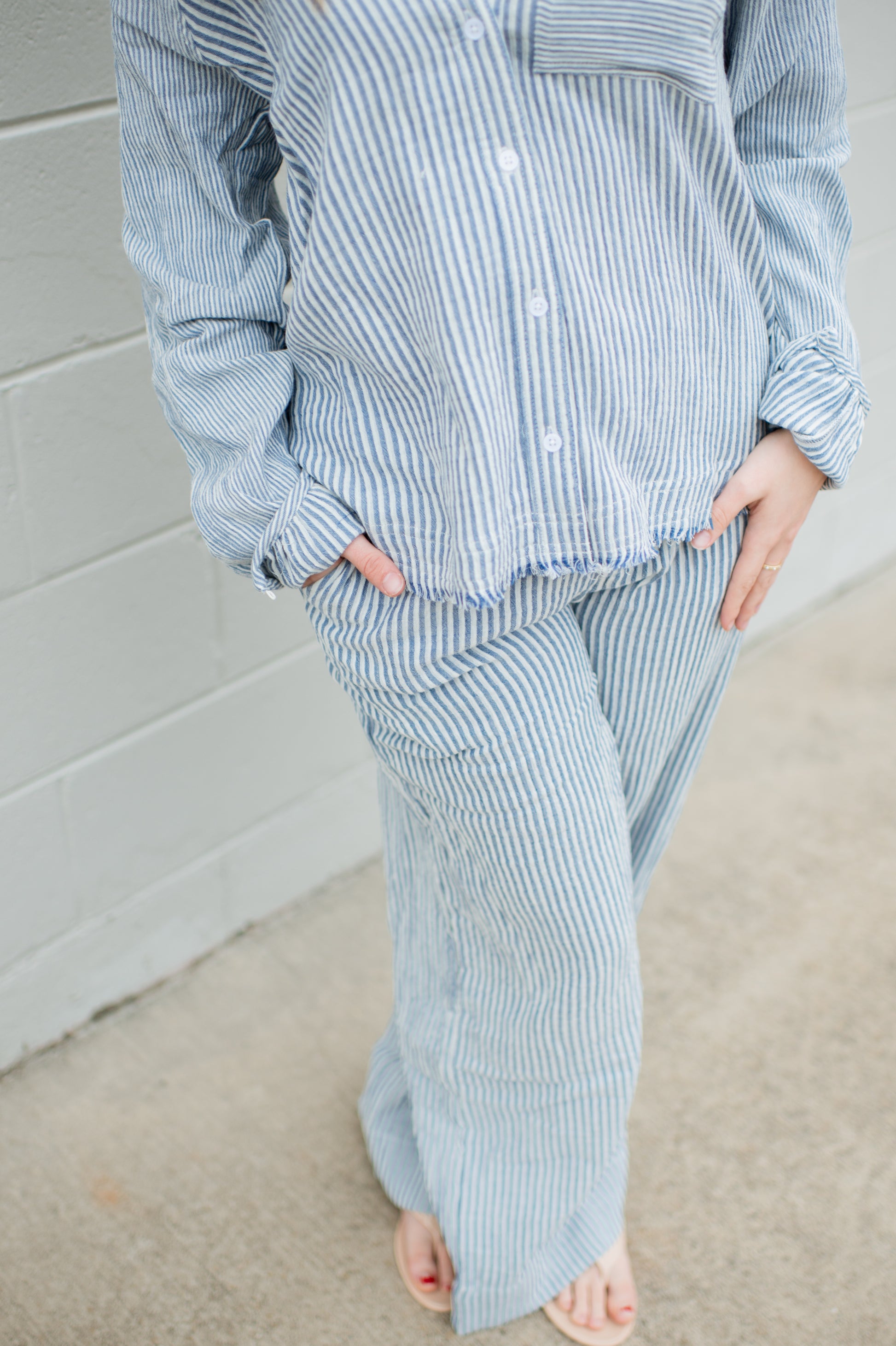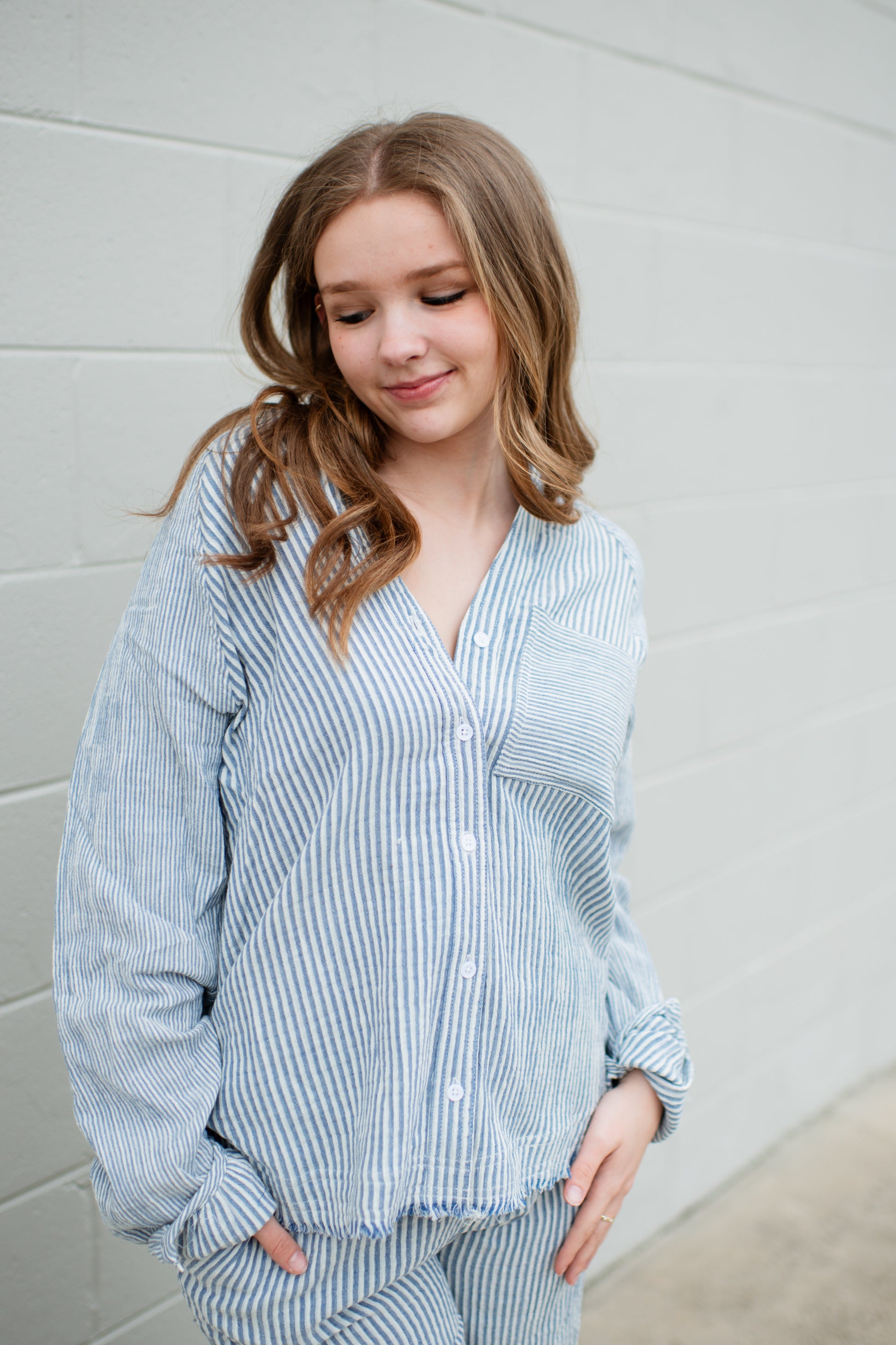 Elevate your wardrobe with the Maia Top, a versatile blue and white striped linen shirt that transitions effortlessly from casual to polished. Crafted from breathable linen, this piece features long sleeves, a functional chest pocket, and a distinctive frayed bottom hem that adds contemporary flair. Whether you're dressing it up for an evening out or keeping it relaxed with your favorite jeans, the Maia Top delivers timeless style and comfort for any occasion.