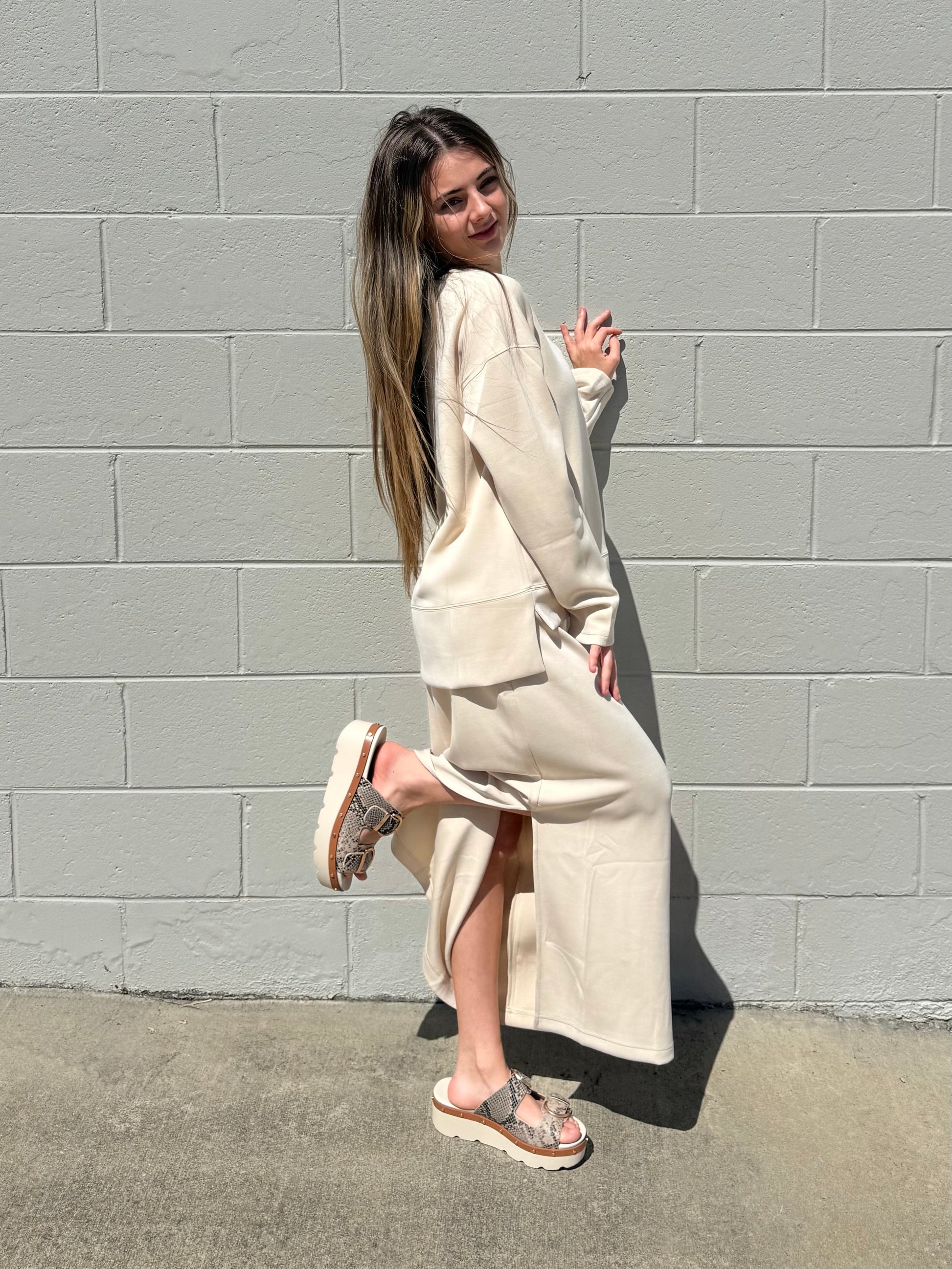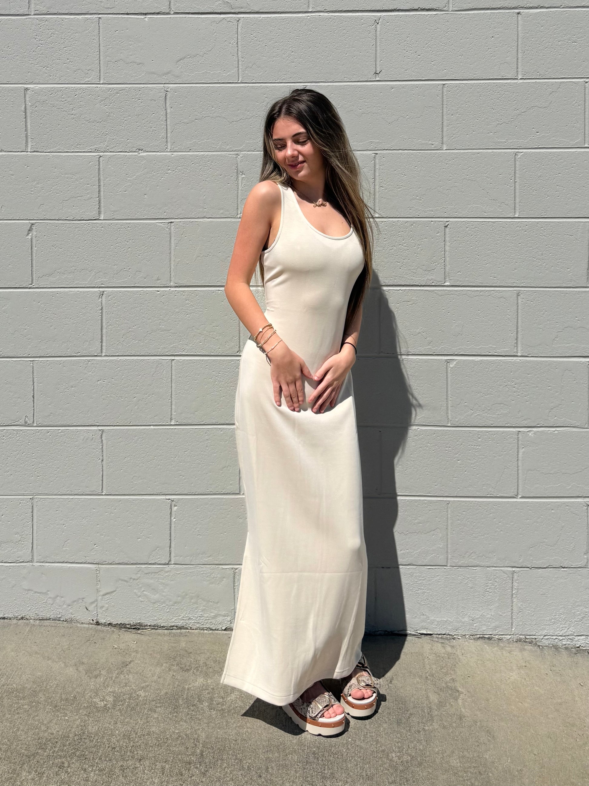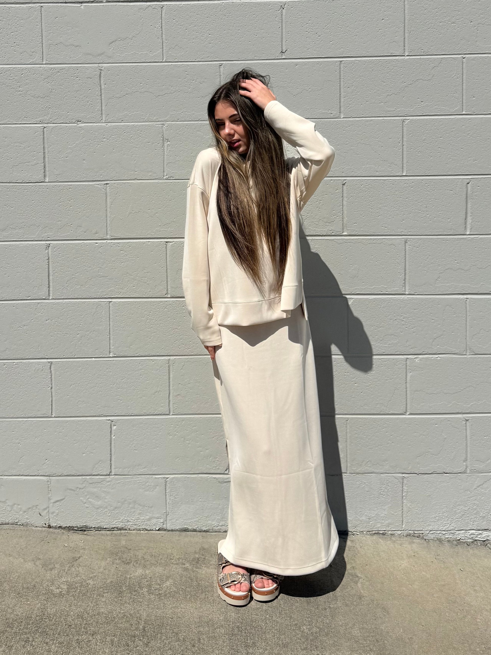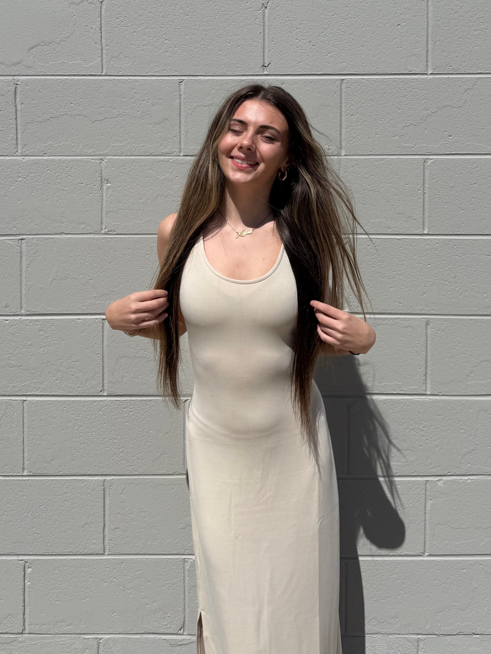 Elevate your transitional wardrobe with the Maple Sweater Set, featuring a light tan, super soft tank t-shirt dress paired with a cozy crewneck sweater. This versatile duo effortlessly moves from warm end-of-summer days to crisp late-fall evenings, allowing you to dress up or down with ease. Its refined simplicity ensures timeless elegance while offering unmatched comfort throughout the seasons.