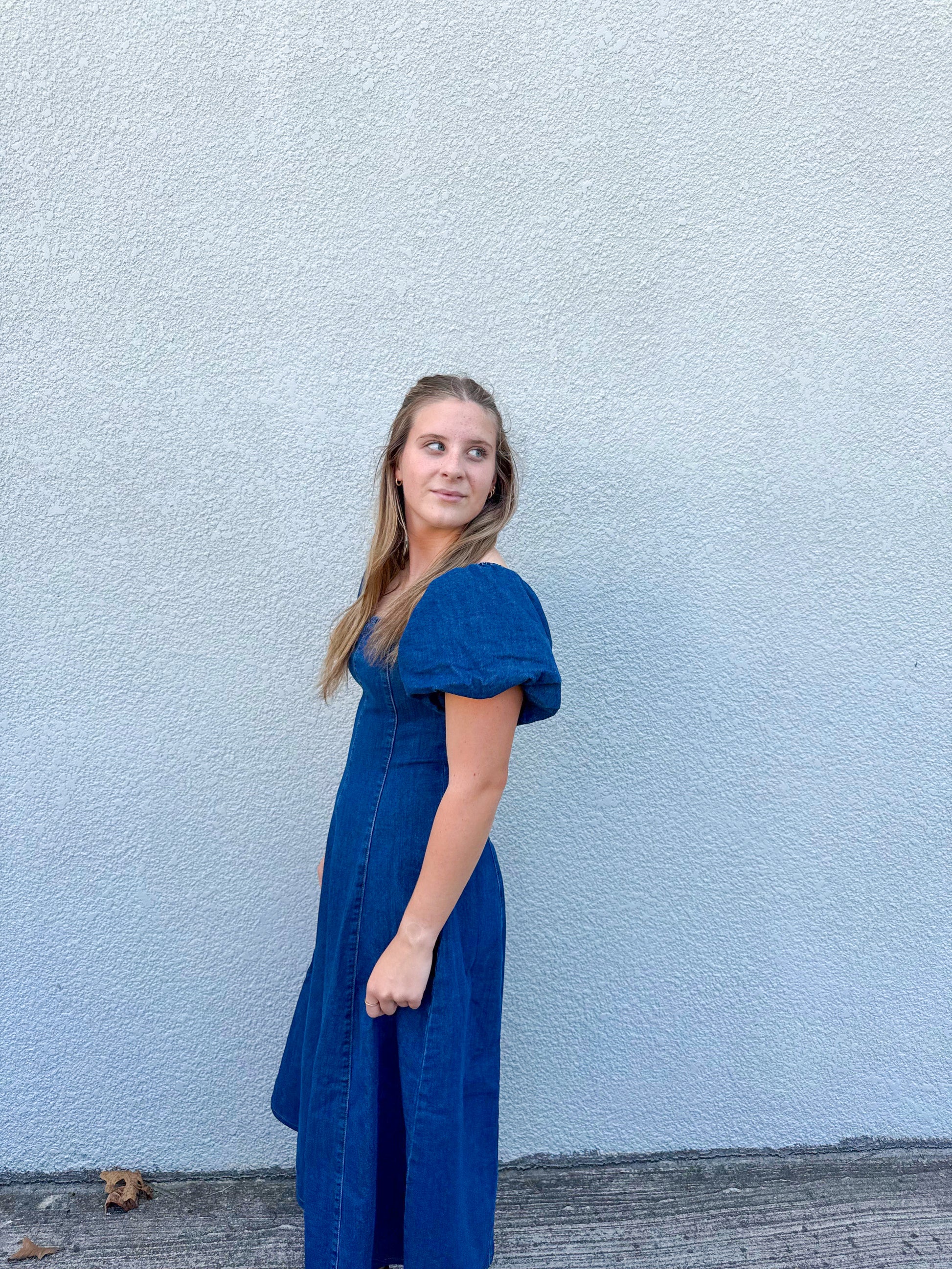 Introducing the Maraya Midi Dress - the perfect mid length medium wash denim dress for your fall wardrobe. With its adorable puff sleeves, this versatile dress can easily be dressed up or down, making it a timeless addition to any outfit. Get ready to turn heads and make a statement with this classic staple.