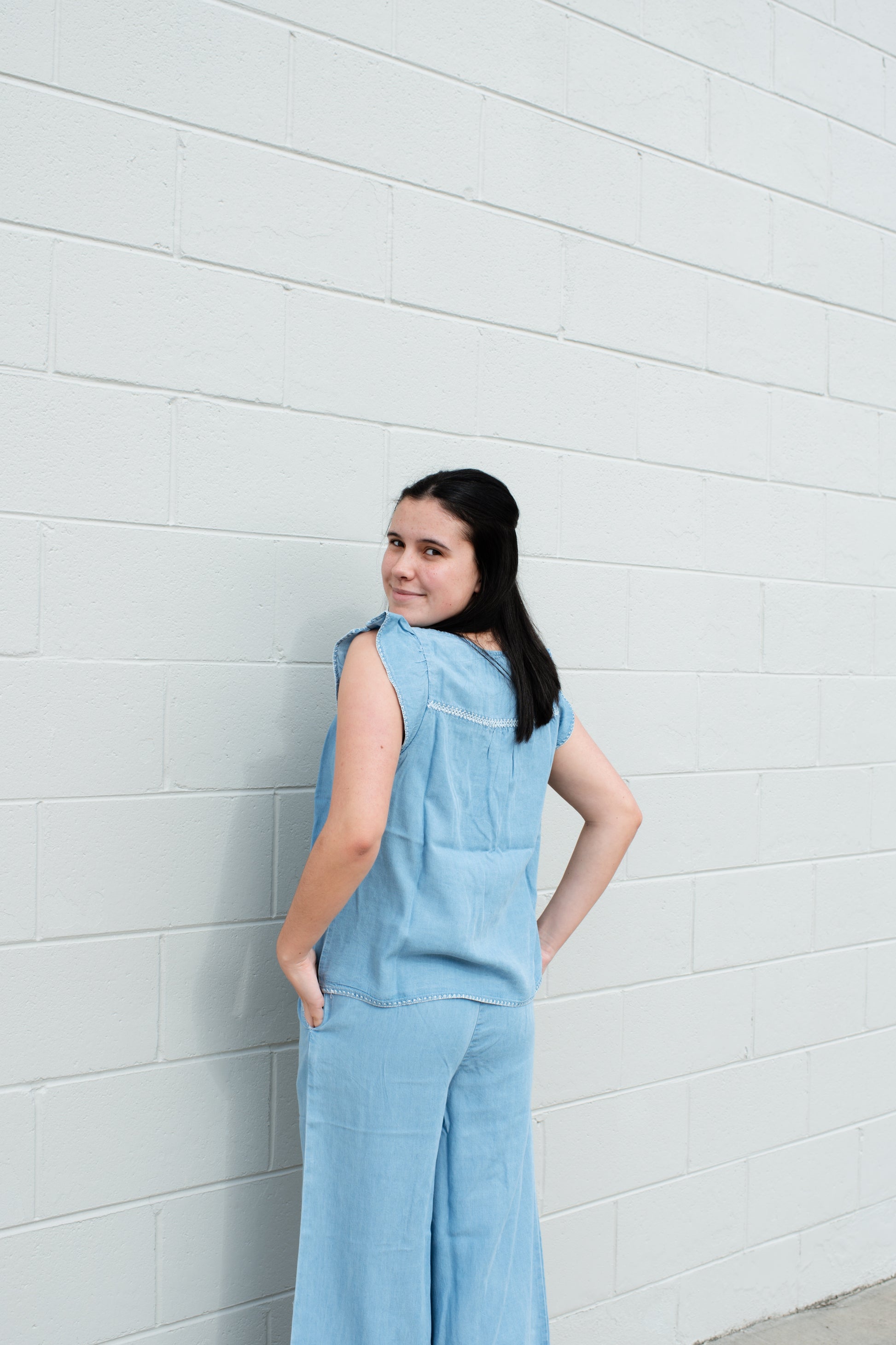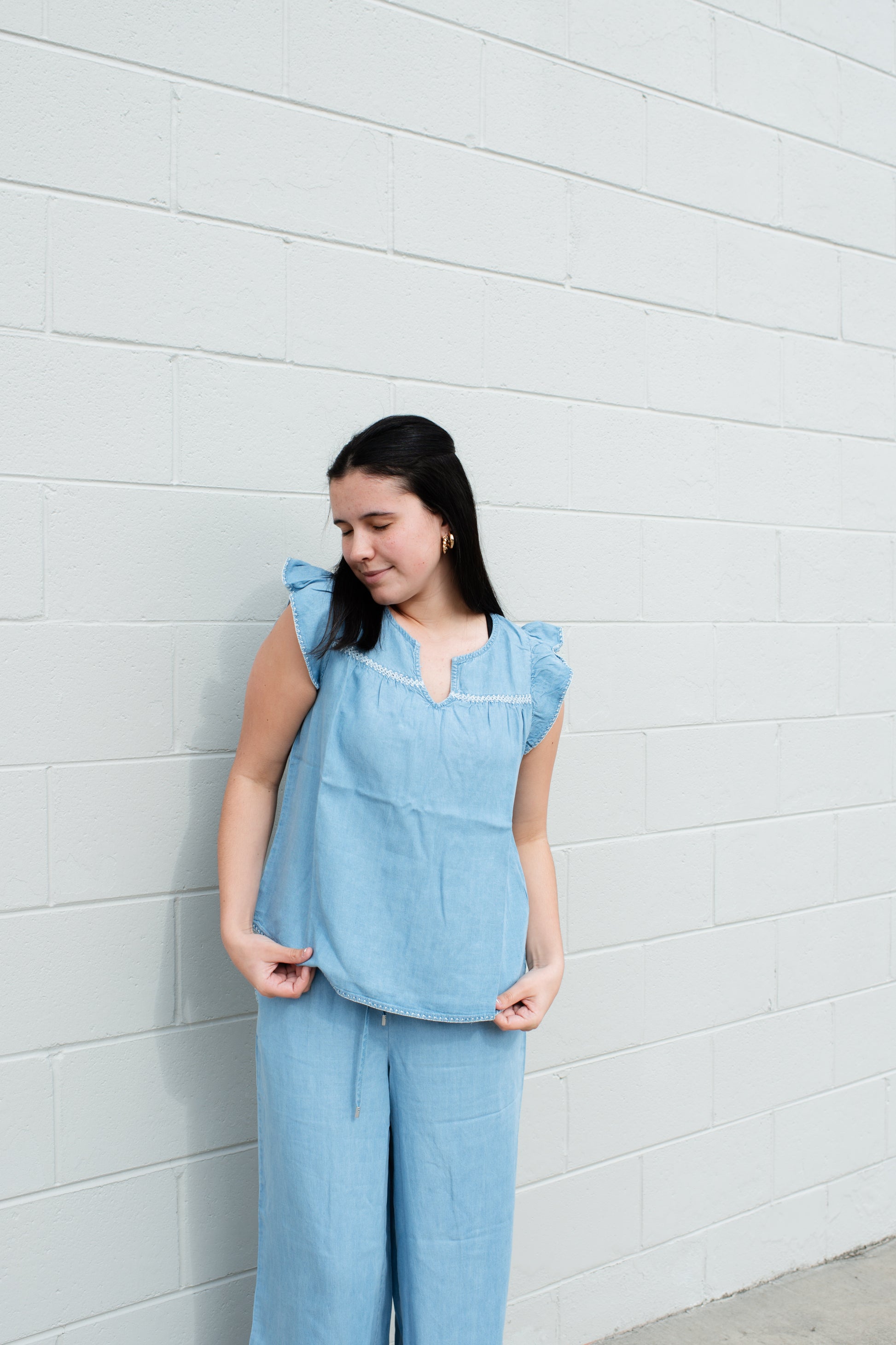Elevate your casual wardrobe with the Mia Top, a fresh take on classic denim style. This lightweight piece features a stunning light blue and white embroidery that adds artisanal charm without the weight of traditional denim. The flattering V-neckline draws the eye while generously open short sleeves provide effortless breathability and movement. Perfect for layering or wearing solo, the Mia Top delivers that coveted denim aesthetic with superior comfort and versatility. Ideal for spring and summer styling.