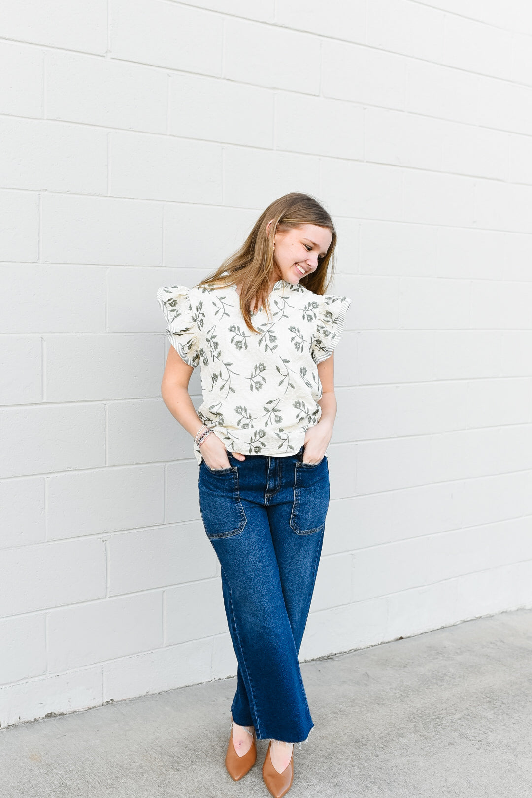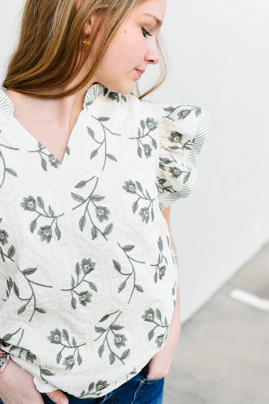 The Monique Top brings effortless charm to your everyday wardrobe. This tan short-sleeved shirt features delicate green embroidered flowers that add a touch of botanical elegance, while the coordinating green striped collar and sleeves create a polished, put-together look. Perfect for layering or wearing solo, this versatile piece transitions seamlessly from casual outings to relaxed social gatherings. The thoughtful design details make it a standout addition that pairs beautifully with your existing basics.
