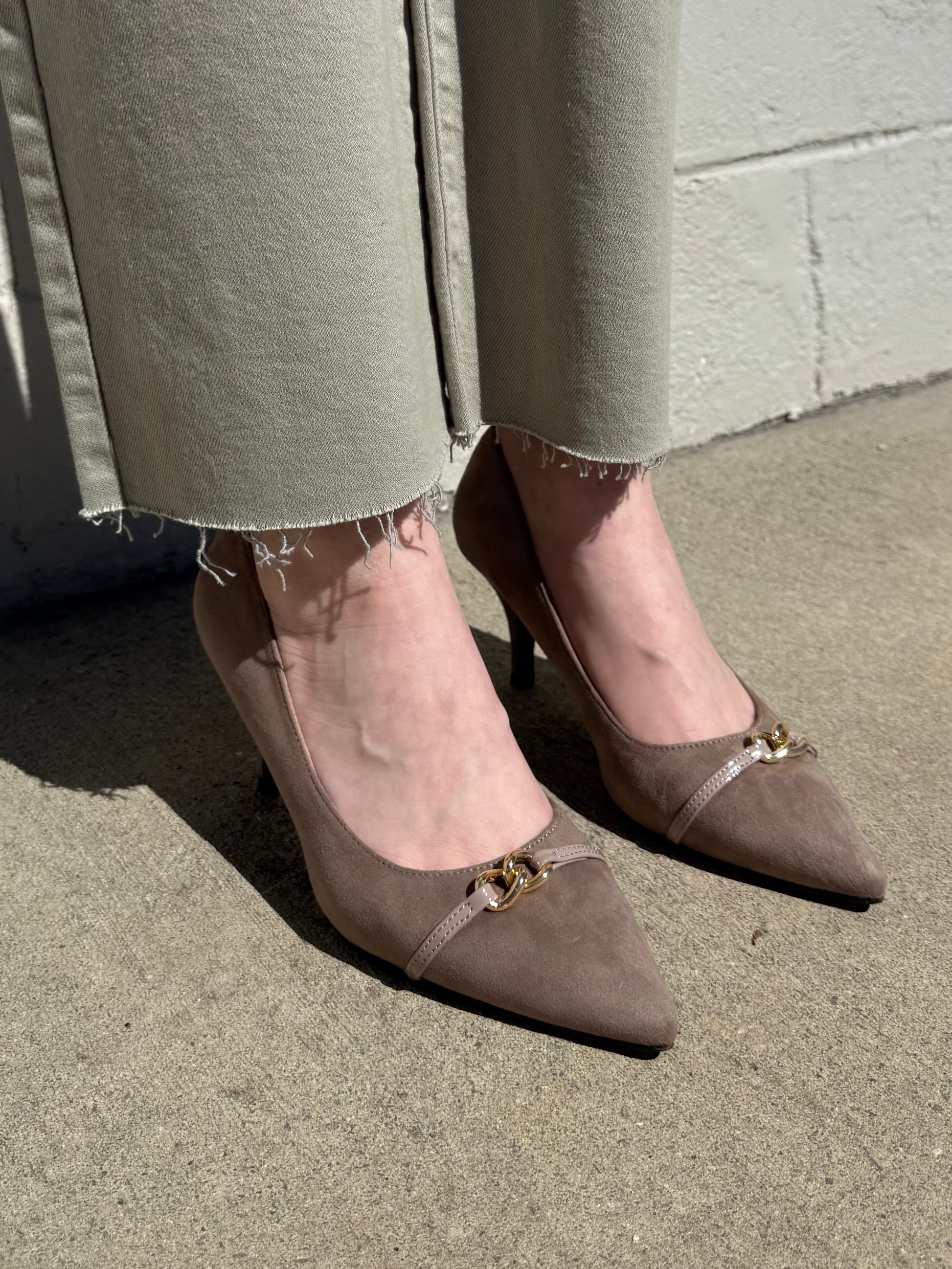 Elevate your ensemble with the Olympia Heel, featuring a sophisticated taupe suede pointed-toe silhouette and a high stiletto heel. The smooth finish lends a refined polish, while the cushioned insole ensures comfort alongside striking height. Ideal for evening affairs or special occasions, these pumps offer a timeless, elegant statement that enhances any outfit.