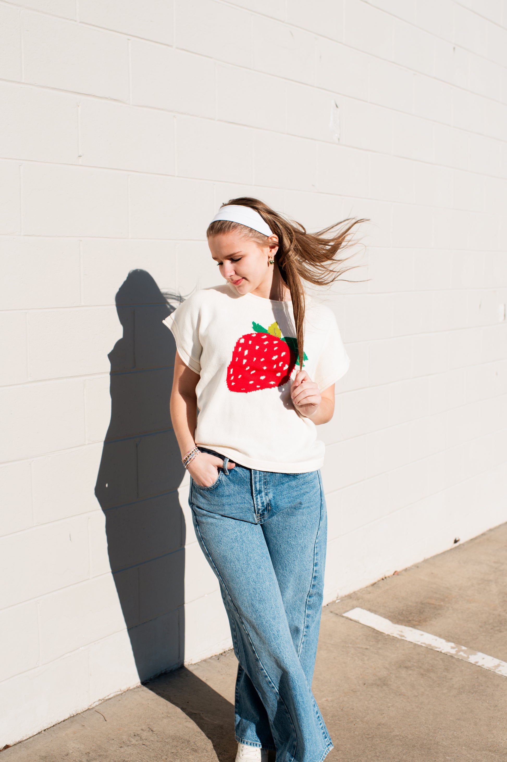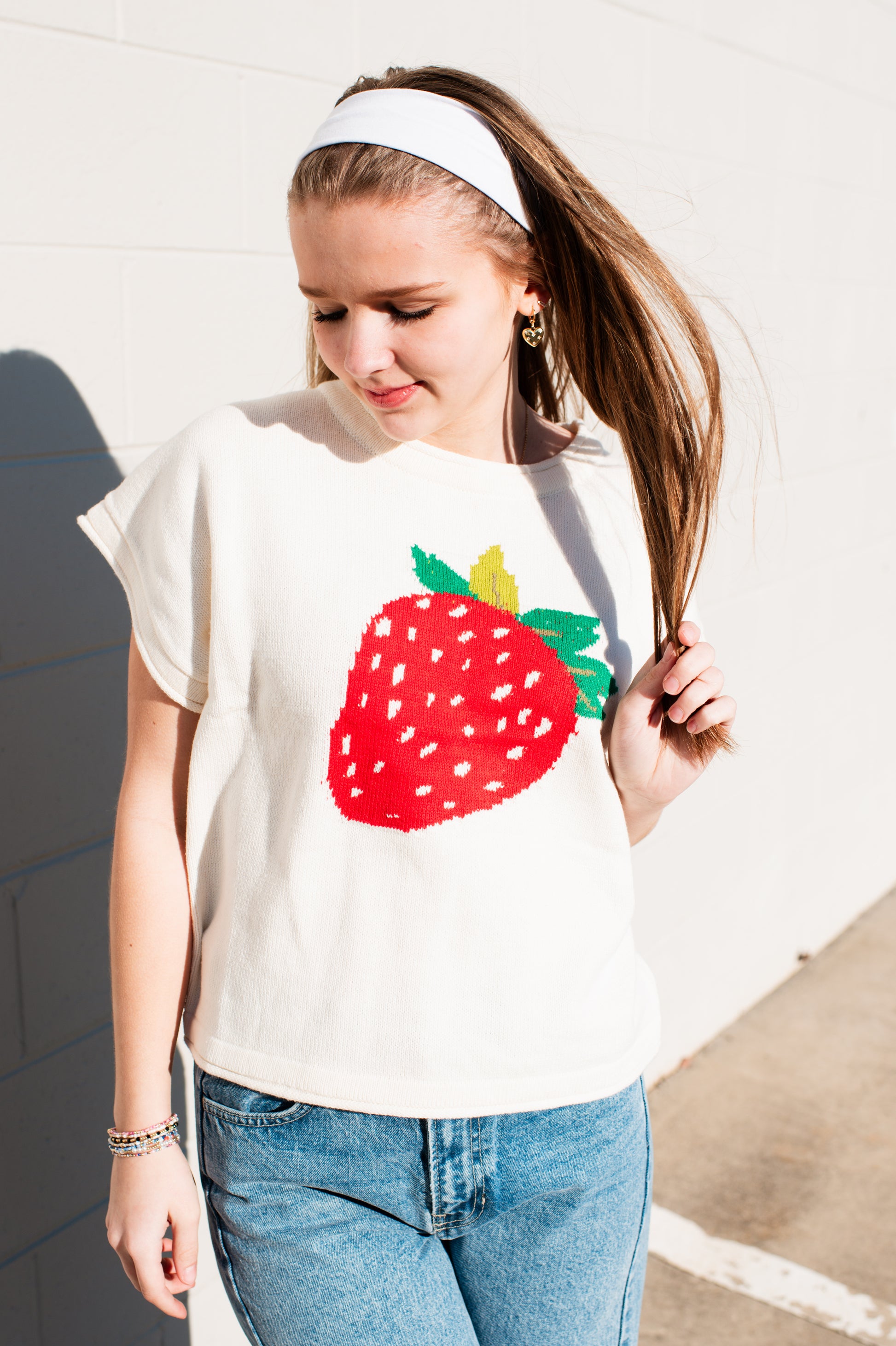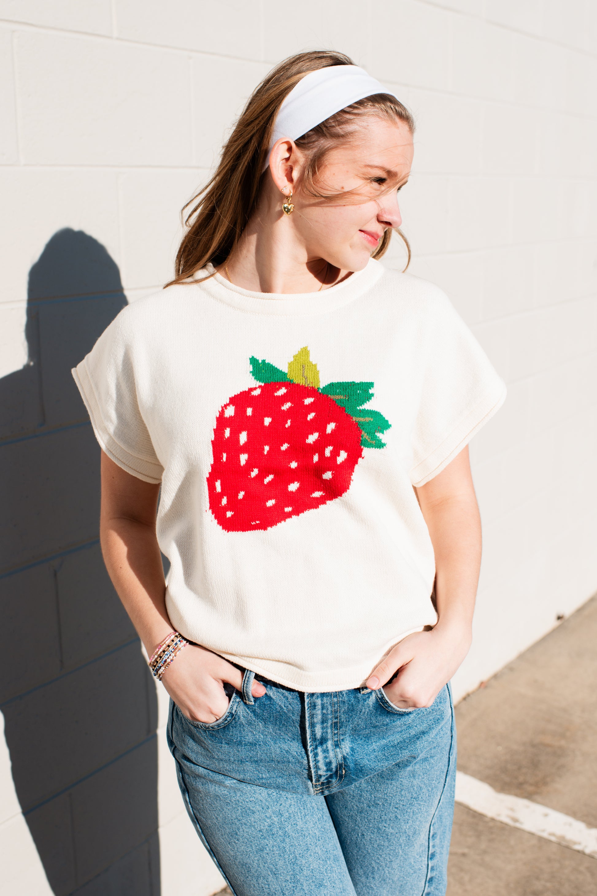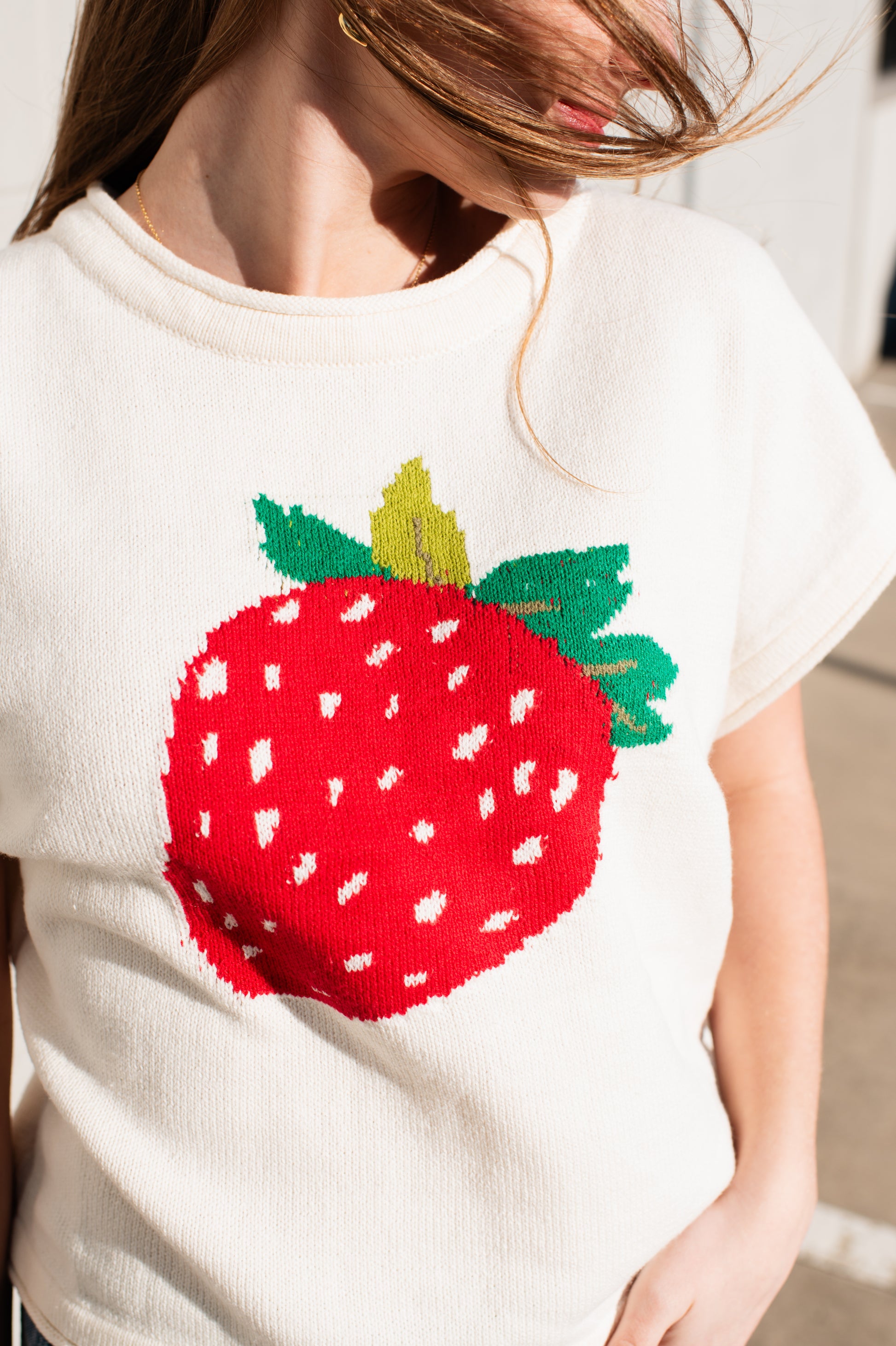 Cozy up in our charming Pixie Top, a cream knit sweater that brings playful style to your everyday wardrobe. Featuring delicate short sleeves and an adorable strawberry design, this piece effortlessly blends comfort with whimsy. Perfect for layering or wearing solo, it's the sweet addition your closet has been craving. Soft, versatile, and undeniably cute—this is the sweater you'll reach for again and again.