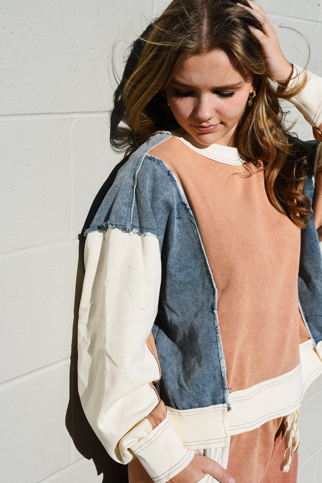 The Reggie Set Pant offers a refined take on streetwear with its harmonious blend of cinnamon, cream, and denim color blocks. Featuring contrast side panels and exposed seaming for subtle texture, these pants are finished with a denim drawstring waistband accented by delicate frayed detailing.