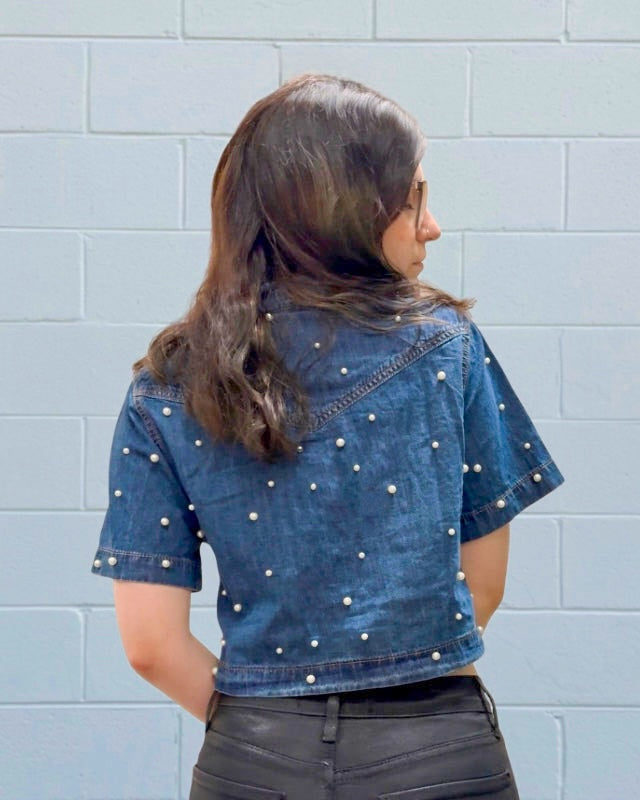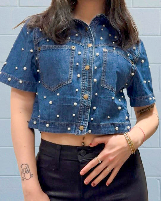 Add a touch of elegance to your casual wardrobe with the River Top. This cropped, medium wash denim shirt features delicate pearl embellishments throughout, offering a refined twist on a classic look. Perfect for elevating your game day style or making a chic statement during fall celebrations, it blends comfort with sophistication seamlessly.