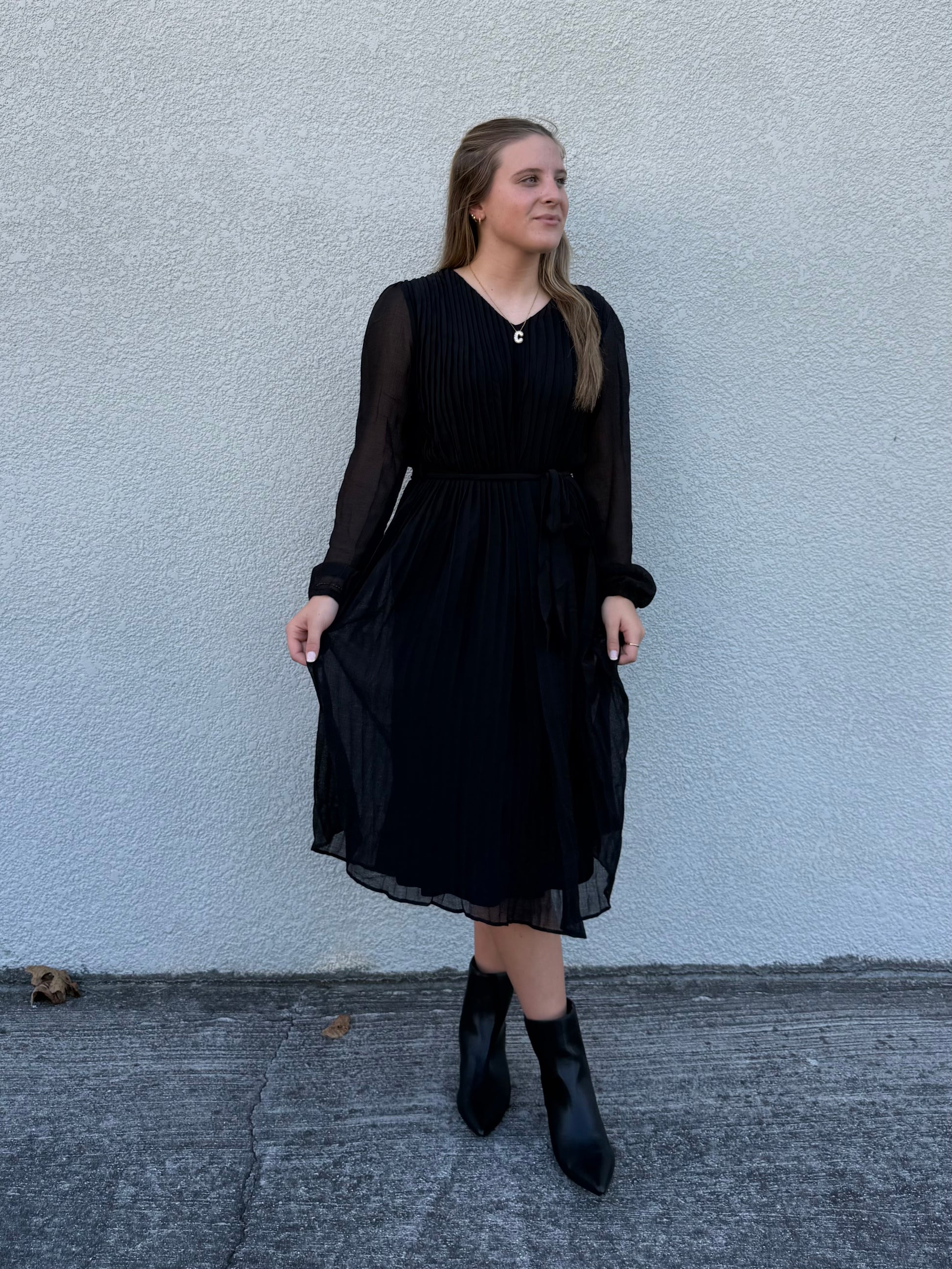 The Scottie Midi Dress features a loose-fitting silhouette with delicate pleats and a refined tie waist detail, creating a flattering and elegant look. This black midi dress is an excellent choice for formal fall events, combining comfort with understated sophistication for seamless seasonal style.