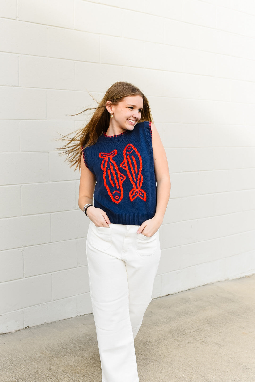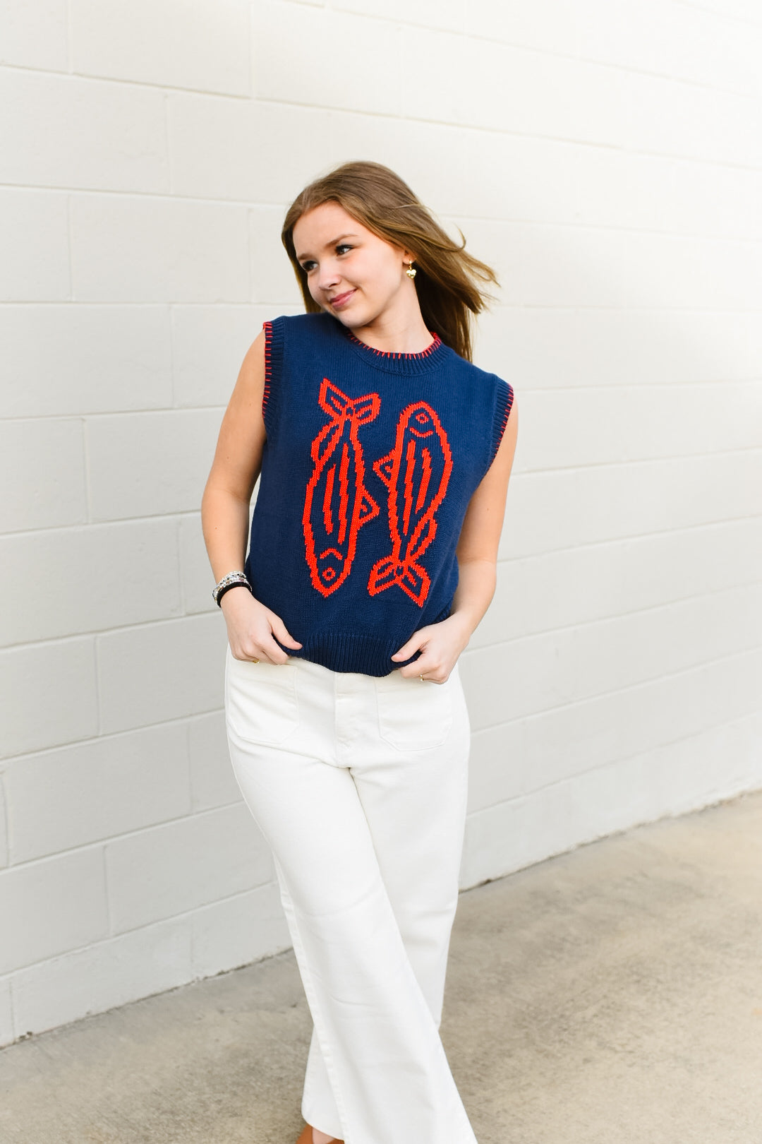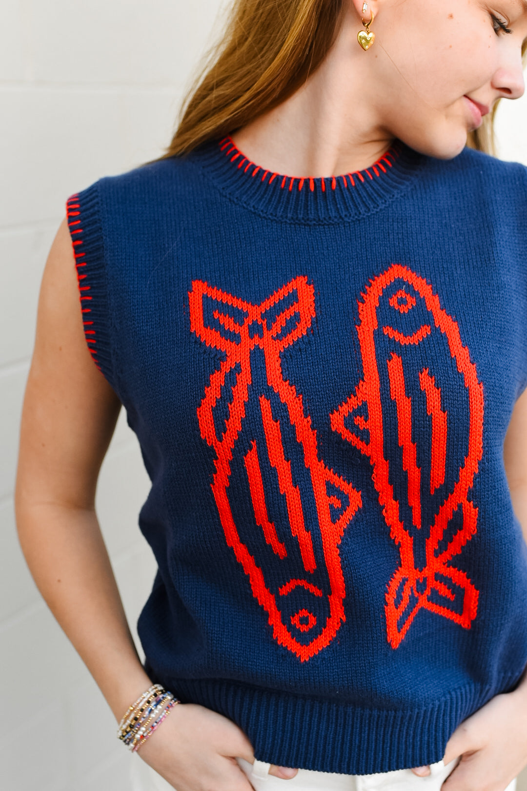 Elevate your casual wardrobe with the Scout Top, a navy blue knit sweater that combines timeless style with playful charm. Two vibrant red fish swim across the front, creating an eye-catching focal point that sparks conversation. The coordinating red knit hem at the neckline and tank sleeves ties the design together beautifully, adding sophisticated color blocking that flatters any complexion. Perfect for layering or wearing solo, this versatile piece transitions seamlessly from weekend outings to relaxed office settings. The quality knit construction ensures lasting comfort and durability, making it a wardrobe staple you'll reach for season after season.