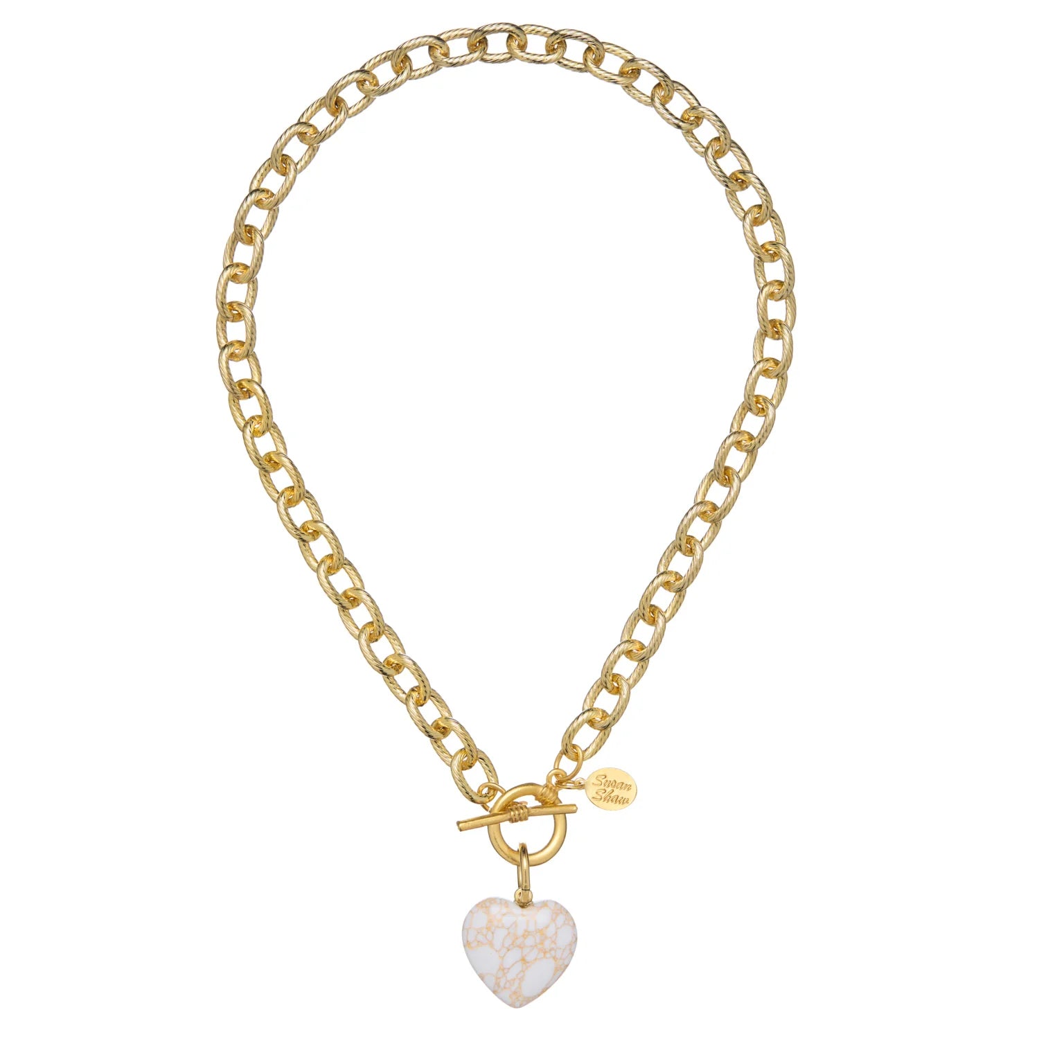 Elevate your everyday style with this stunning gold chain necklace, featuring a captivating white marbled heart pendant that makes a bold statement. The smooth, polished heart showcases beautiful natural veining, adding depth and character to your look. Secured with a reliable toggle clasp, this piece offers both security and ease of wear. Perfect for layering or wearing solo, this versatile necklace transitions seamlessly from casual days to special occasions. A timeless accessory that celebrates elegance and individuality.