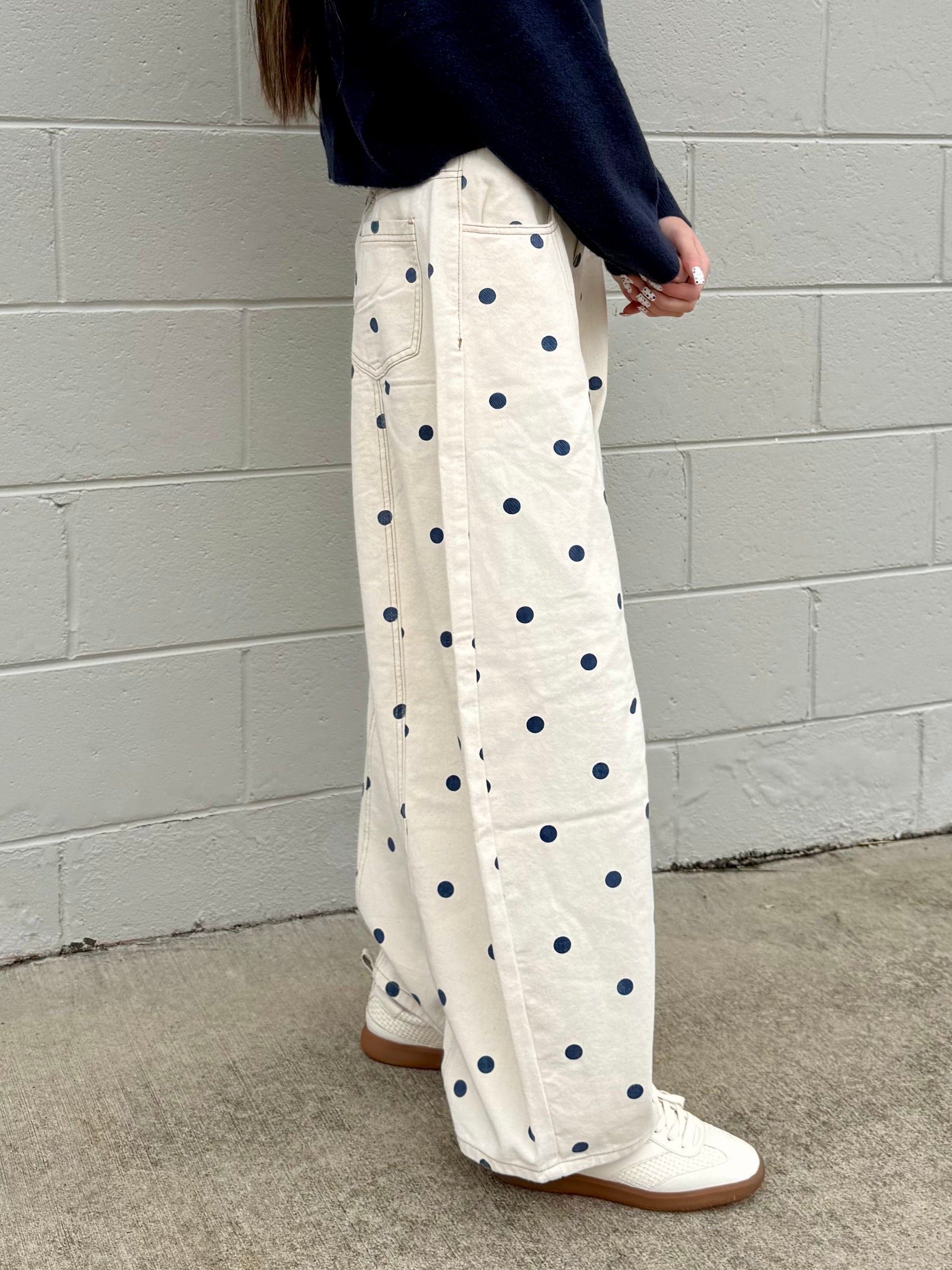Introducing the Thalsa Pant - cream colored wide leg barrel jeans with navy blue polka dots. Elevate your style this cold season with these cute statement pants, perfect for pairing with a cozy sweater. Stay warm and stylish at the same time.