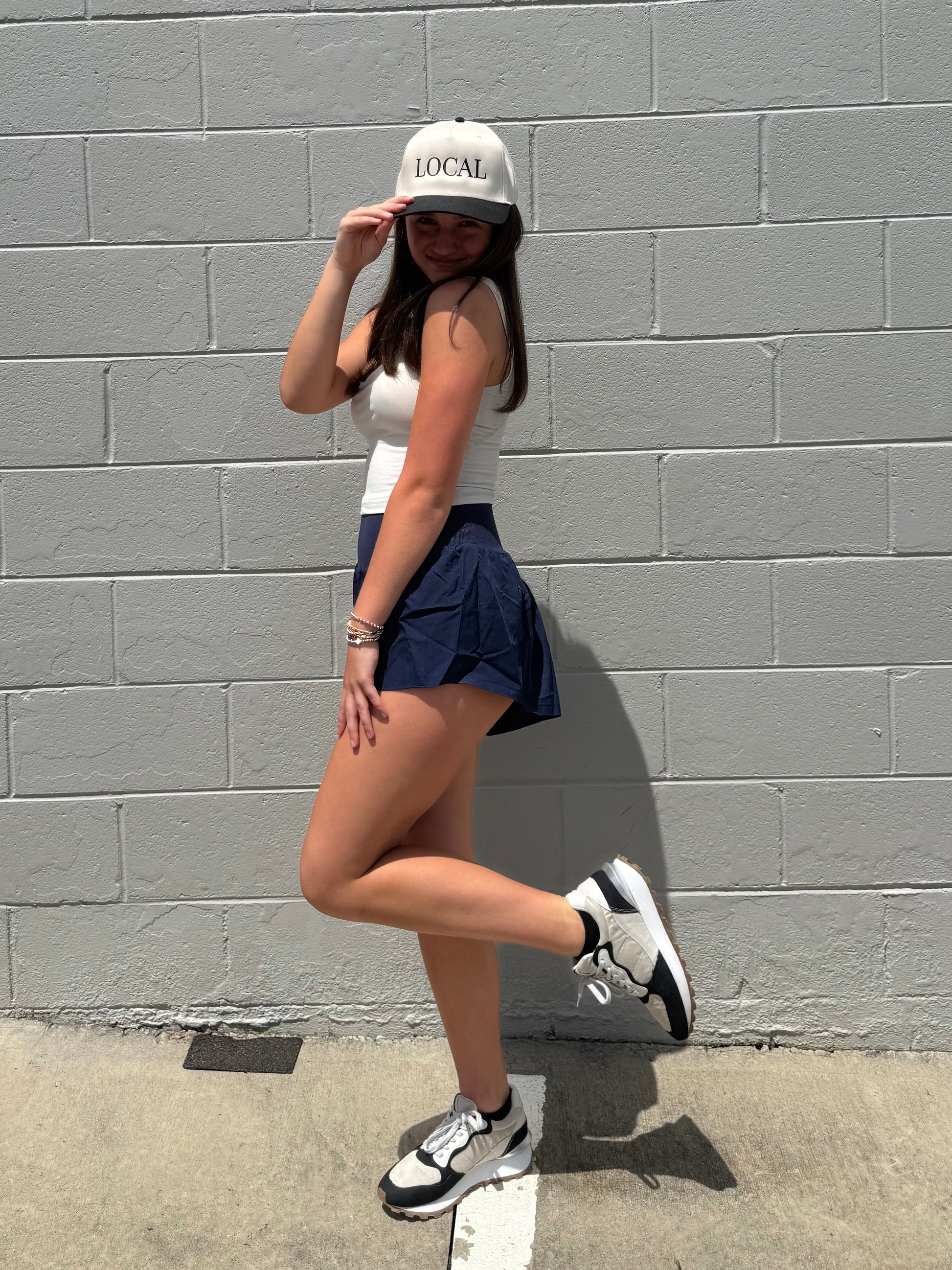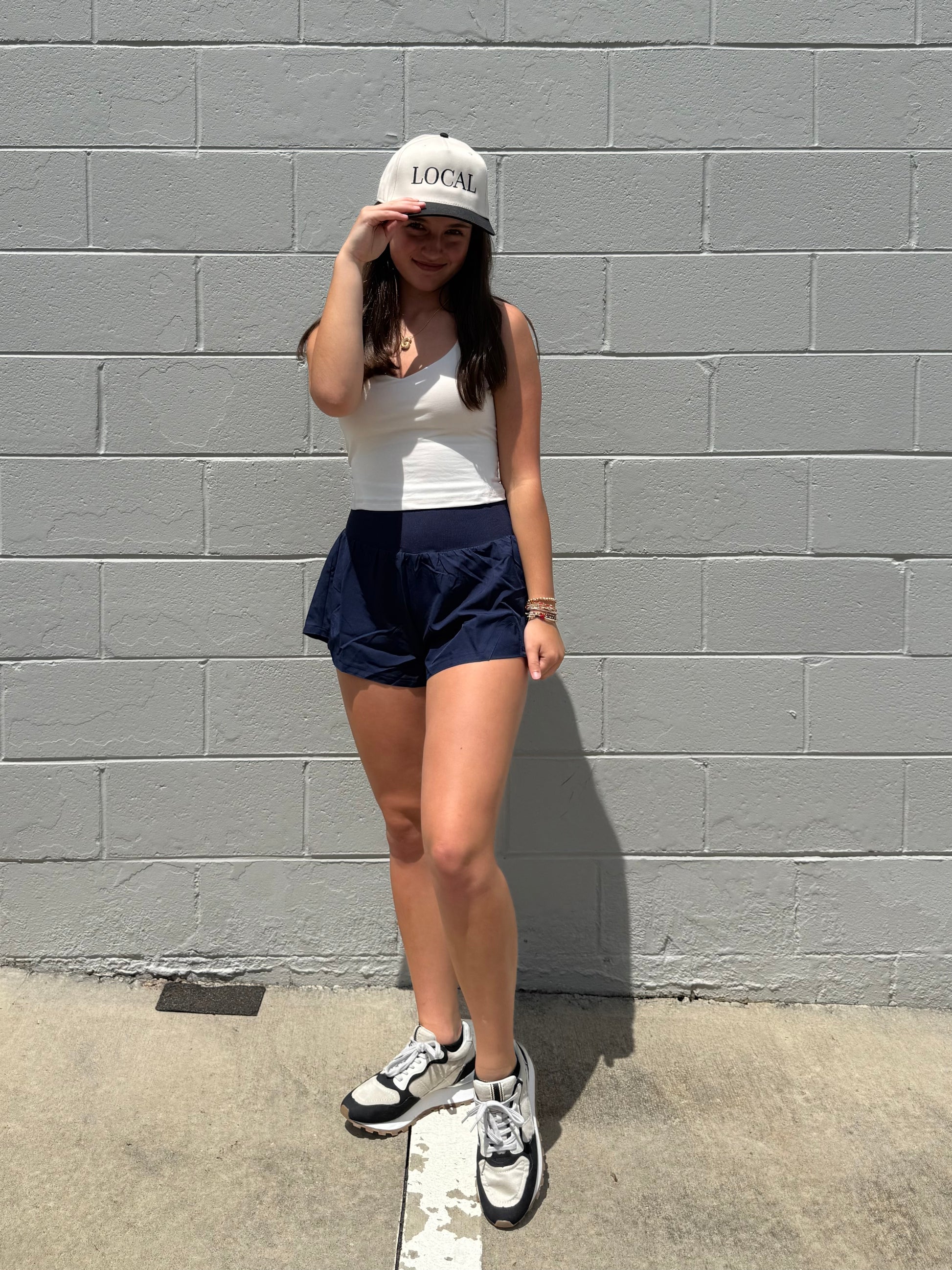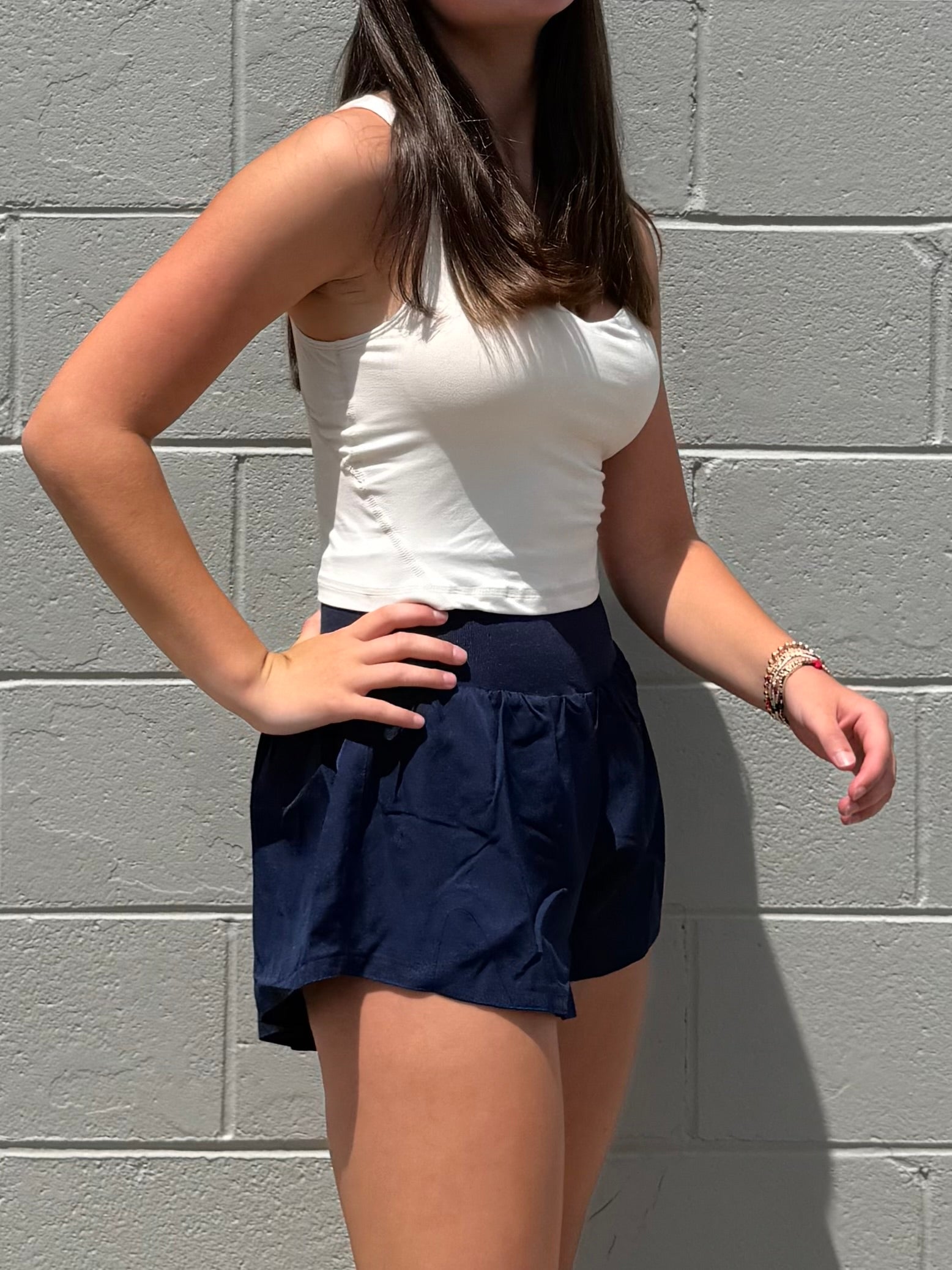 These navy blue Trista Shorts feature a thick waistband designed for secure, comfortable wear during athletic activities. Their airy fabric ensures breathability, making them ideal for intense workouts or casual, everyday outfits. Combining functionality with style, they offer freedom of movement and a flattering fit.