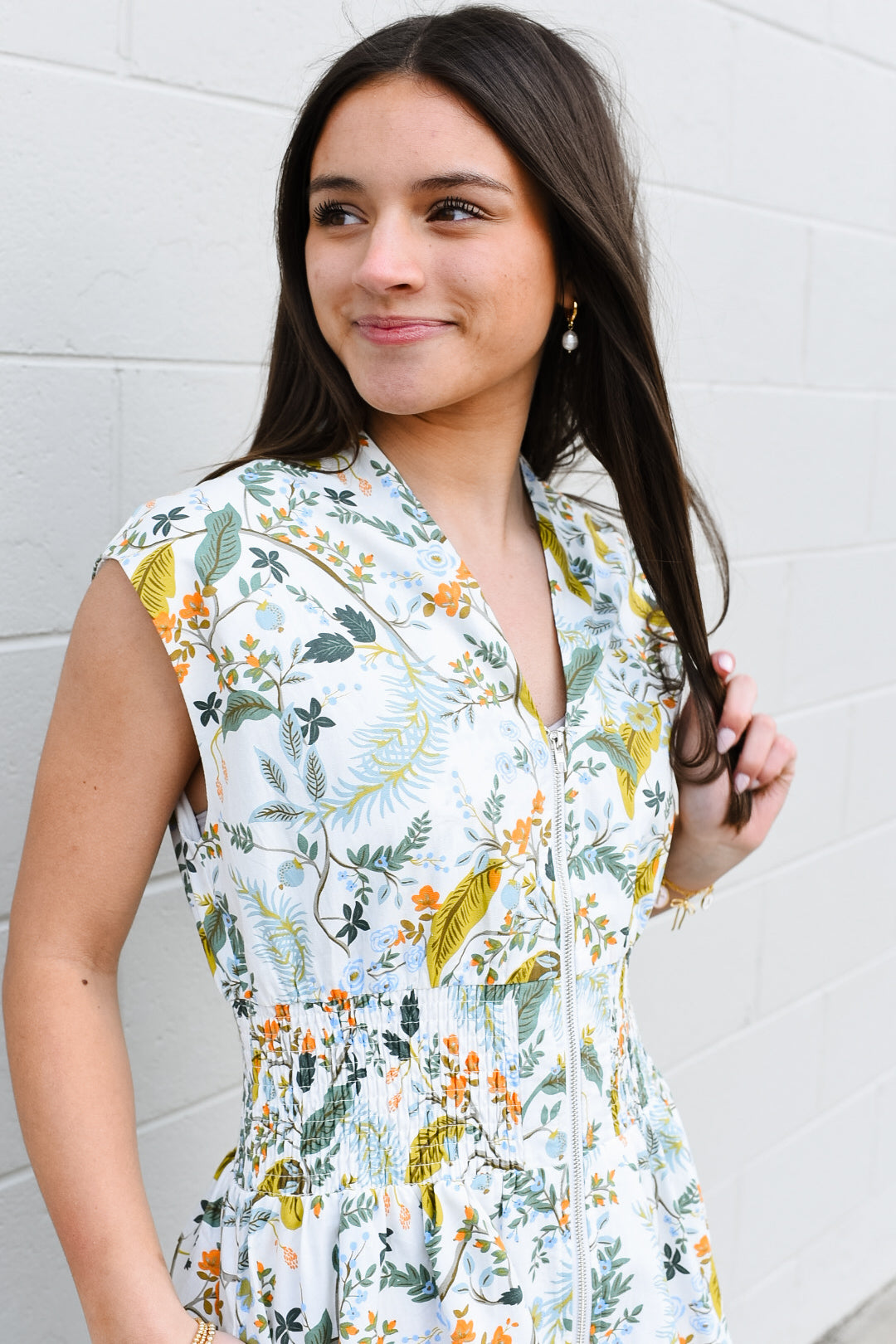 The Ventry Maxi Dress brings effortless elegance with its vibrant forest pattern set against a crisp white backdrop. A sleek silver zipper runs the full length, offering easy styling versatility, while the flattering V-neckline and ruched waistband create a refined silhouette that works beautifully on every body type. Whether you're dressing up for an occasion or elevating your everyday look, this dress delivers impact without compromise.